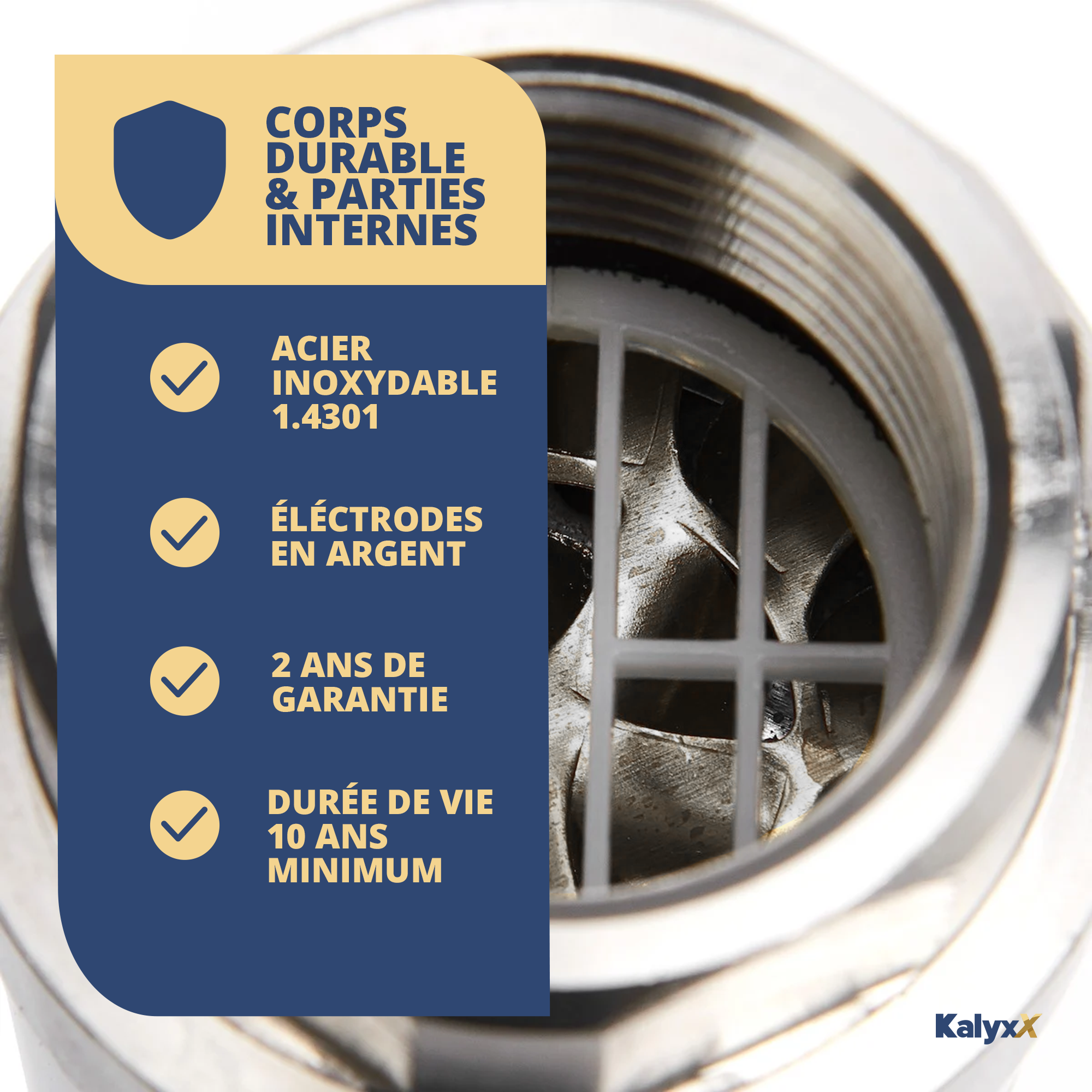 L'IPS Kalyxx est un adoucisseur d'eau innovant qui modifie la structure du calcaire en le transformant de calcite en aragonite, une forme non-adhérente qui ne s'accumule pas. Grâce à sa technologie brevetée de Polarisation Galvanique Turbulente (TGP), il empêche les dépôts et obstructions tout en préservant les minéraux bénéfiques pour la santé. Sans utiliser de produits chimiques ni nécessiter d'énergie externe, l'IPS Kalyxx offre une solution écologique et économique pour protéger vos équipements, vos canalisations et améliorer la qualité de l'eau.