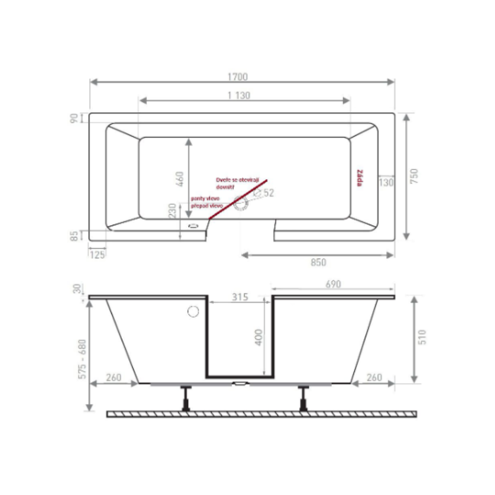 Caractéristiques de la baignoire PMR 170x75 cm avec porte ouverture à droite, 228L, blanc (SATVD170P):