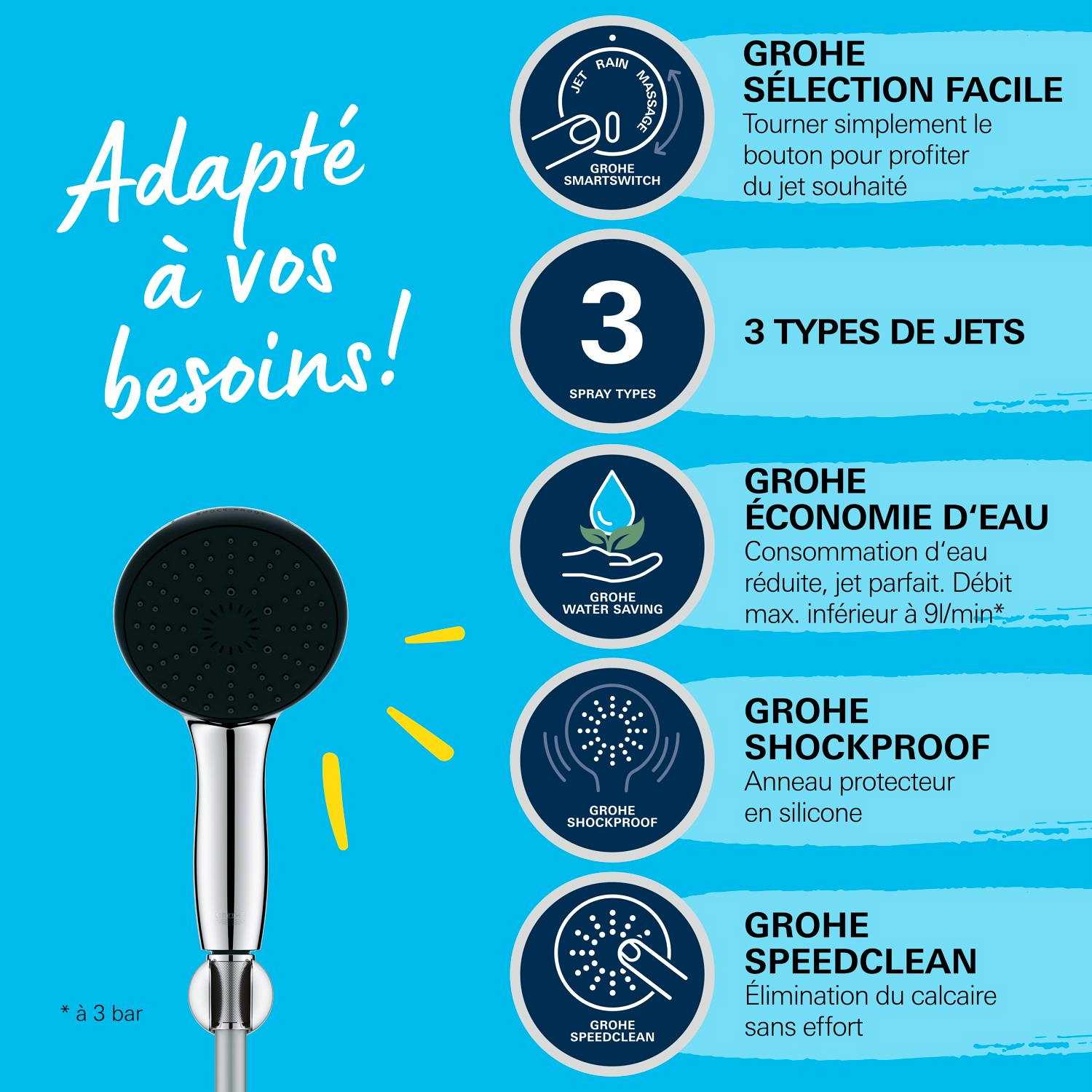 Caractéristiques du set de douche avec support mural + Douchette 3 jets, chrome Grohe Vitalio Start 110 (G26769001) :