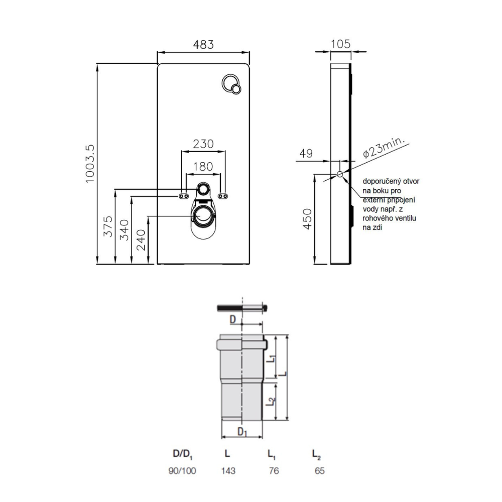 - Fournis avec pipe d'évacuation en PEHD (noire) diamètre 90 mm (Type Geberit / Grohe ) vers un réseau PVC (gris) en diamètre 100 mm (Standard Français)