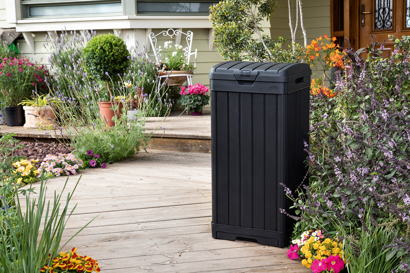 Sa structure en plastique résiste à l’humidité et aux UV sans rouiller ni se détériorer. Avec son double couvercle, sa fermeture hermétique et son compartiment intérieur coulissant, elle limite les odeurs, protège le contenu de la pluie et facilite le nettoyage au quotidien.