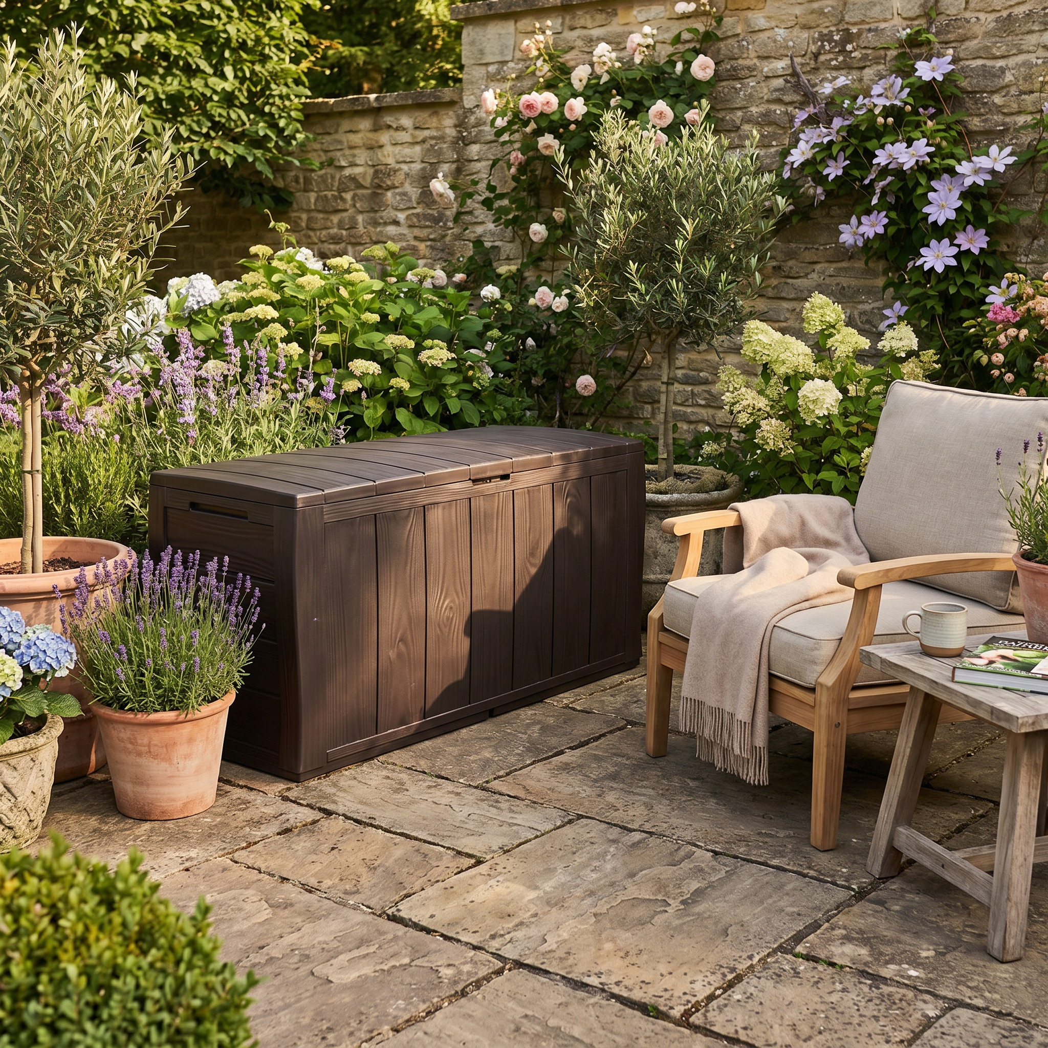 Sa structure en résine résiste à la pluie, à l’humidité et aux UV sans rouiller ni pourrir. Avec sa finition aspect bois marron, sa capacité de 270 L et son couvercle robuste pouvant servir de siège d’appoint, il allie rangement pratique et intégration facile dans tout espace extérieur.