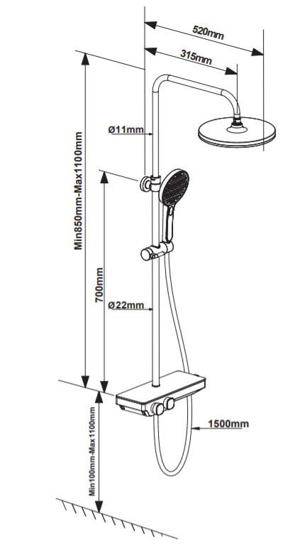 - La hauteur réglable de la douchette sur la barre est de 85 à 110 cm.