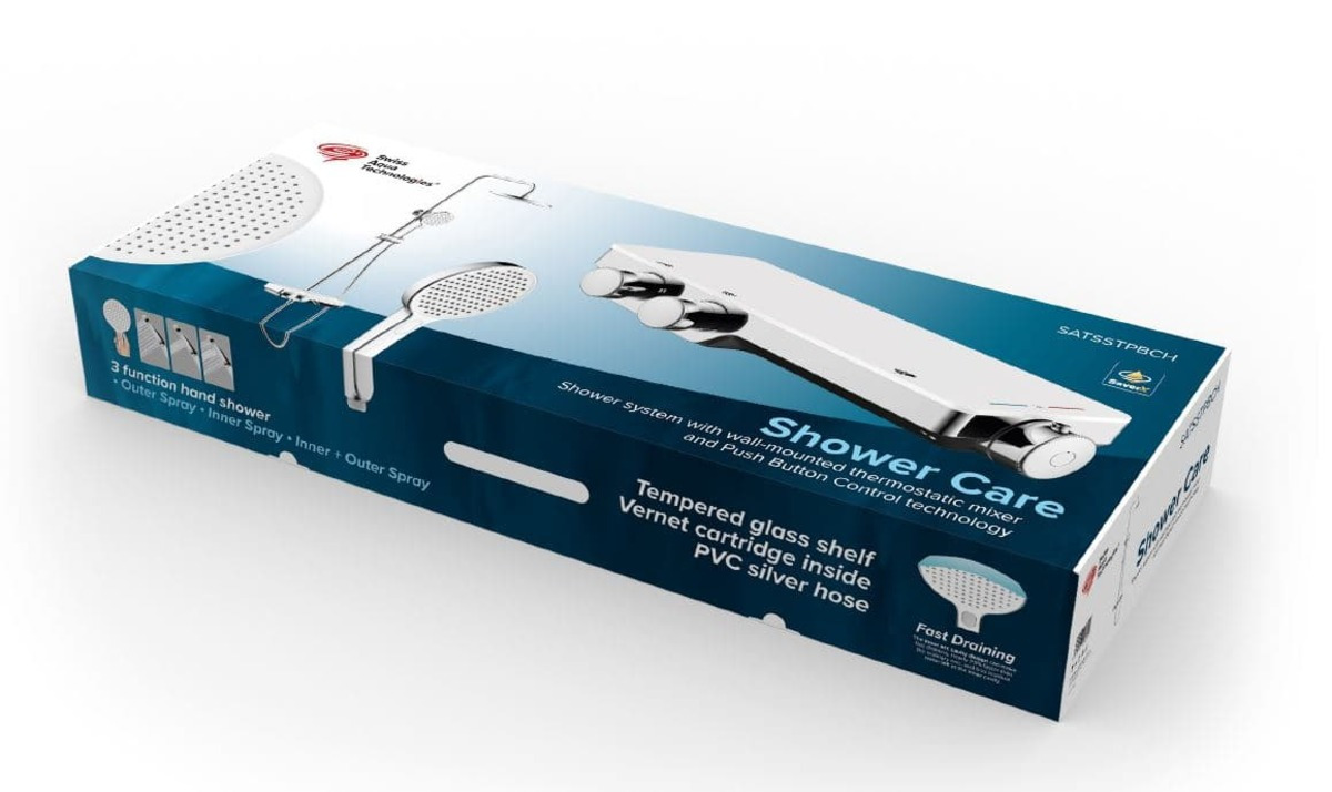 Le système de douche SAT est équipé d'un robinet thermostatique et d'une tablette en verre pratique. Le système de douche dispose d'une technologie innovante Push Button Control , qui permet de commuter les courants à l'aide d'un bouton et en même temps de réguler le débit directement sur le bouton.