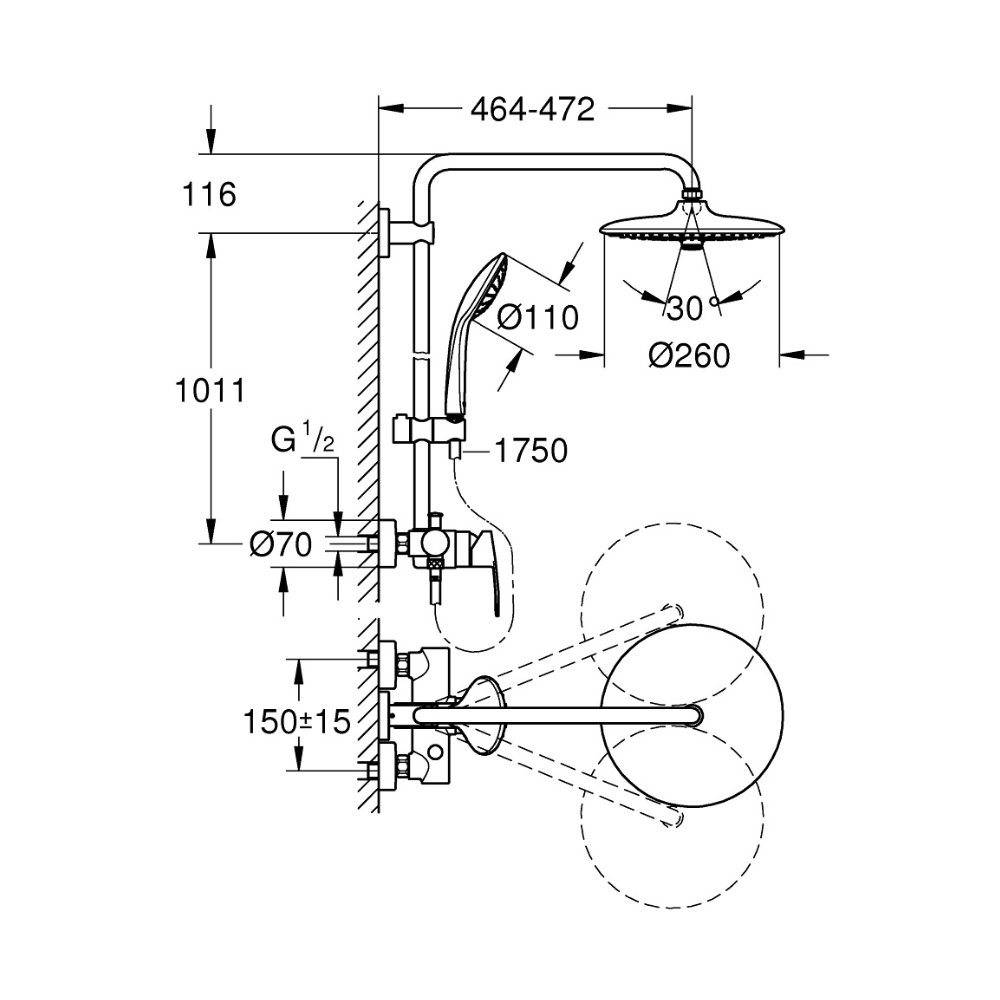 Caractéristiques de la colonne de douche avec mitigeur monocommande, Chrome Grohe Vitalio Joy System 260 (27684001) :
