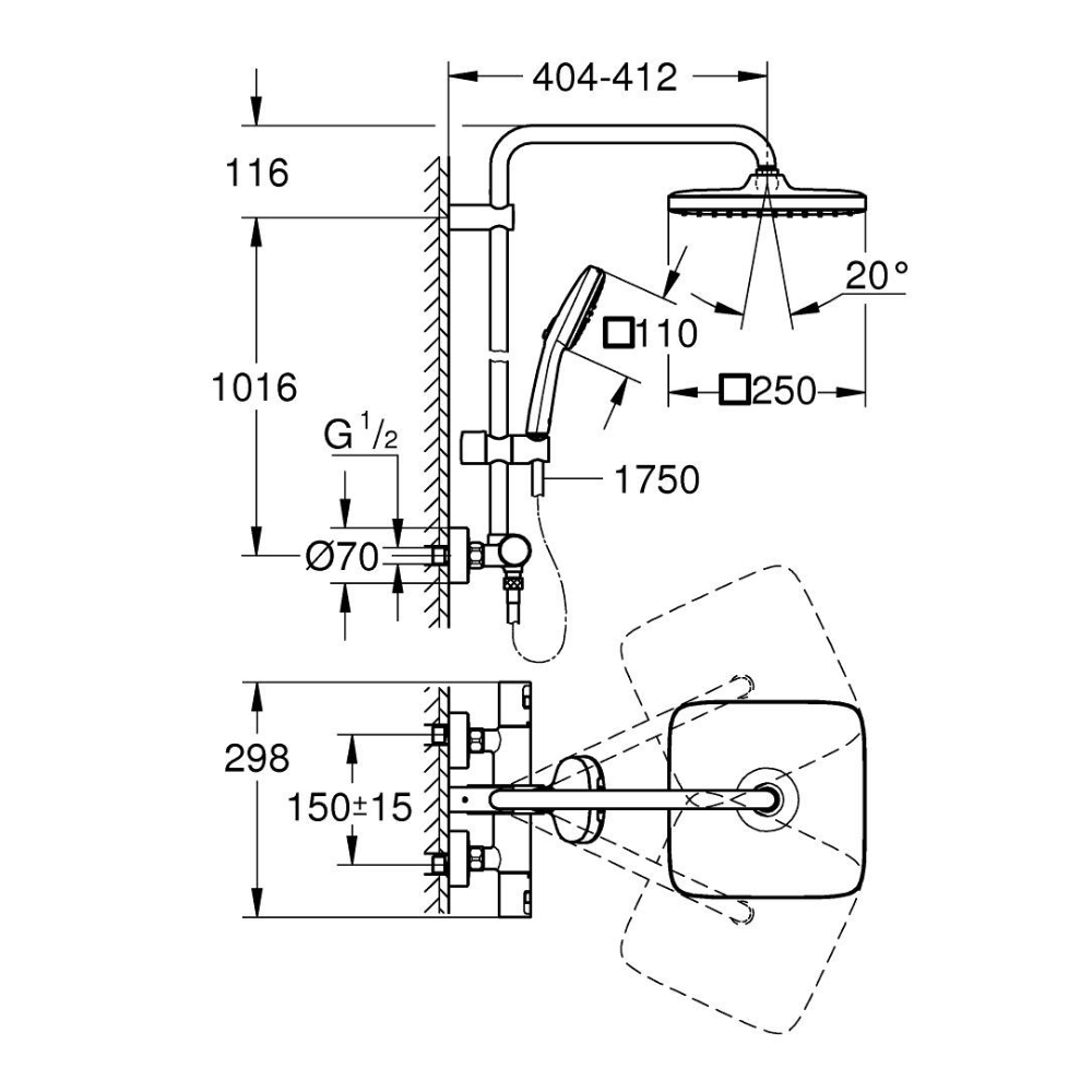 - Diamètre douche de tête (mm):250