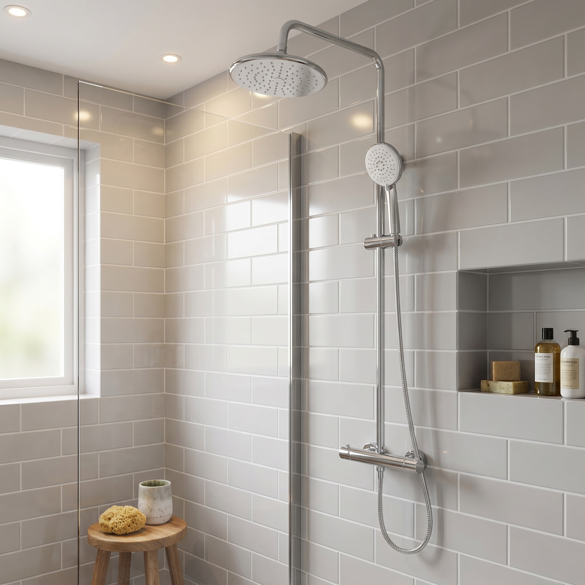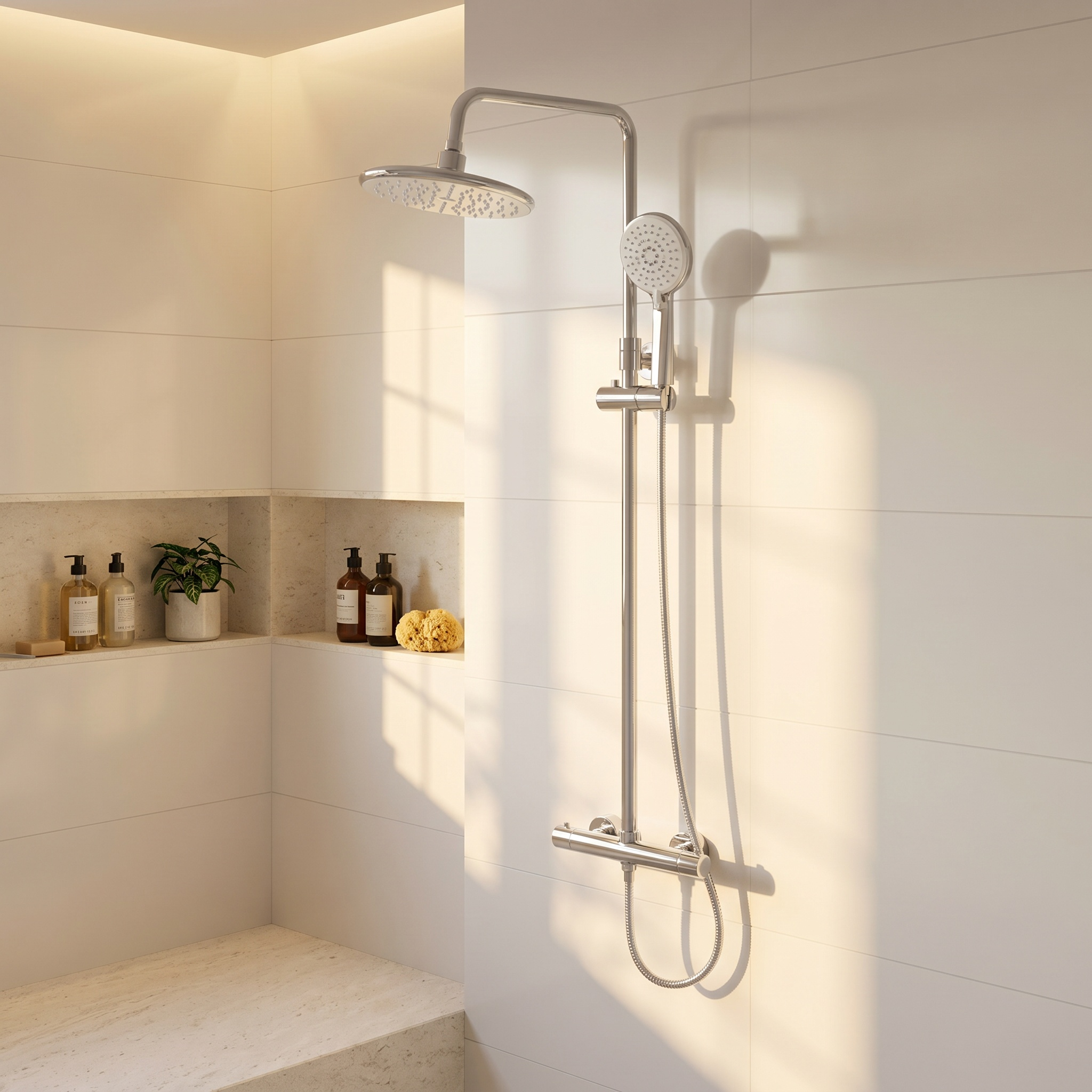 Basic ensemble de douche avec mitigeur thermostatique, douche de tête, douchette à main, chrome (SATSSTKEB)