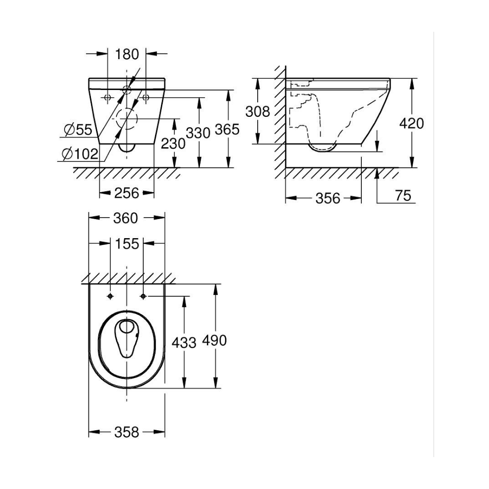 Caractéristiques de la cuvette WC suspendu compact sans bride en céramique avec fixations invisibles, Grohe Euro Ceramic, blanc (102486SH00) :