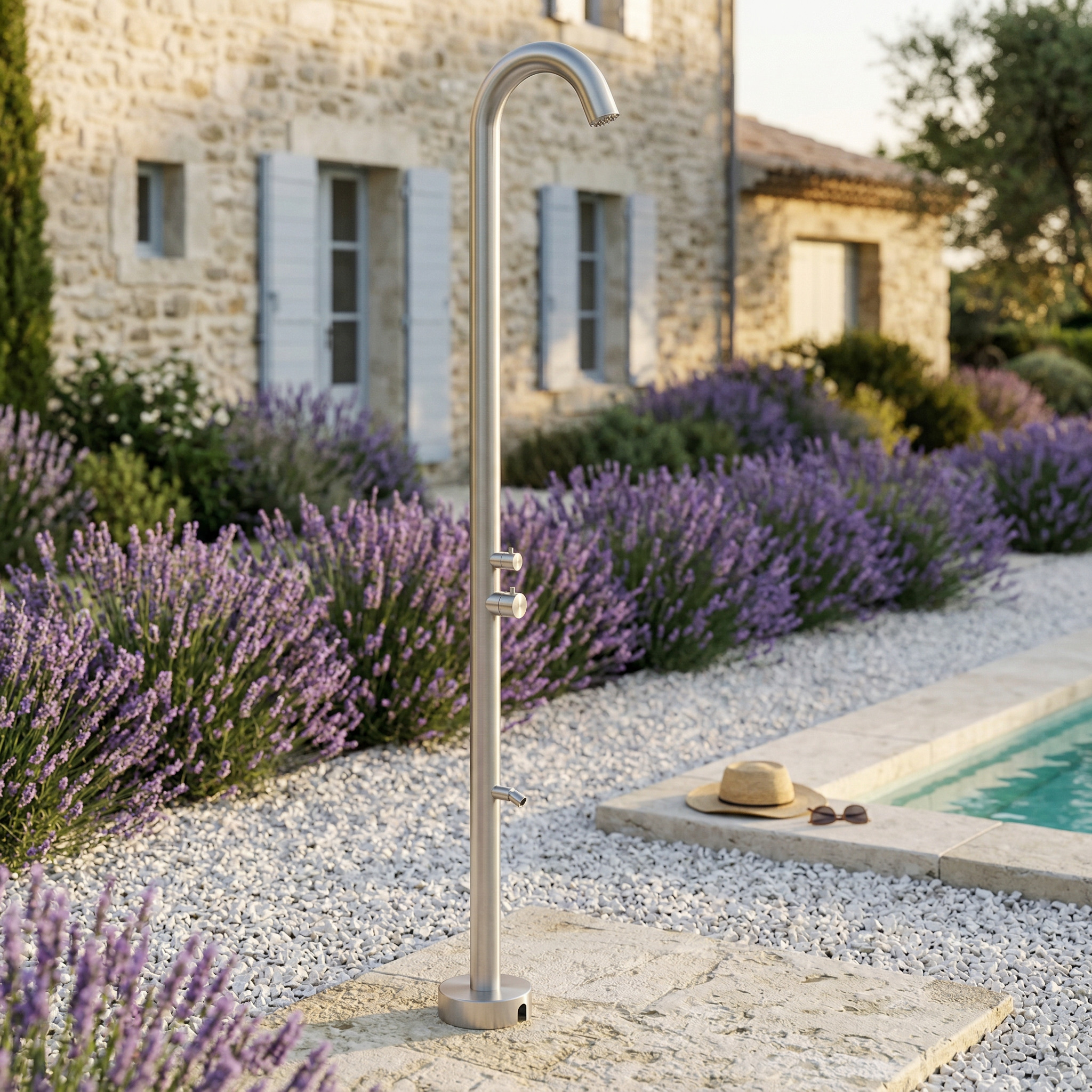 Cette douche d'extérieure combine liberté d’installation (eau chaude et froide, ou simple tuyau d’arrosage), une robustesse maximale et un design premium et intemporel. Que vous cherchiez une solution pour vous rincer avant/après la piscine, ou une installation complète avec eau chaude, cette douche répond à toutes les configurations.
