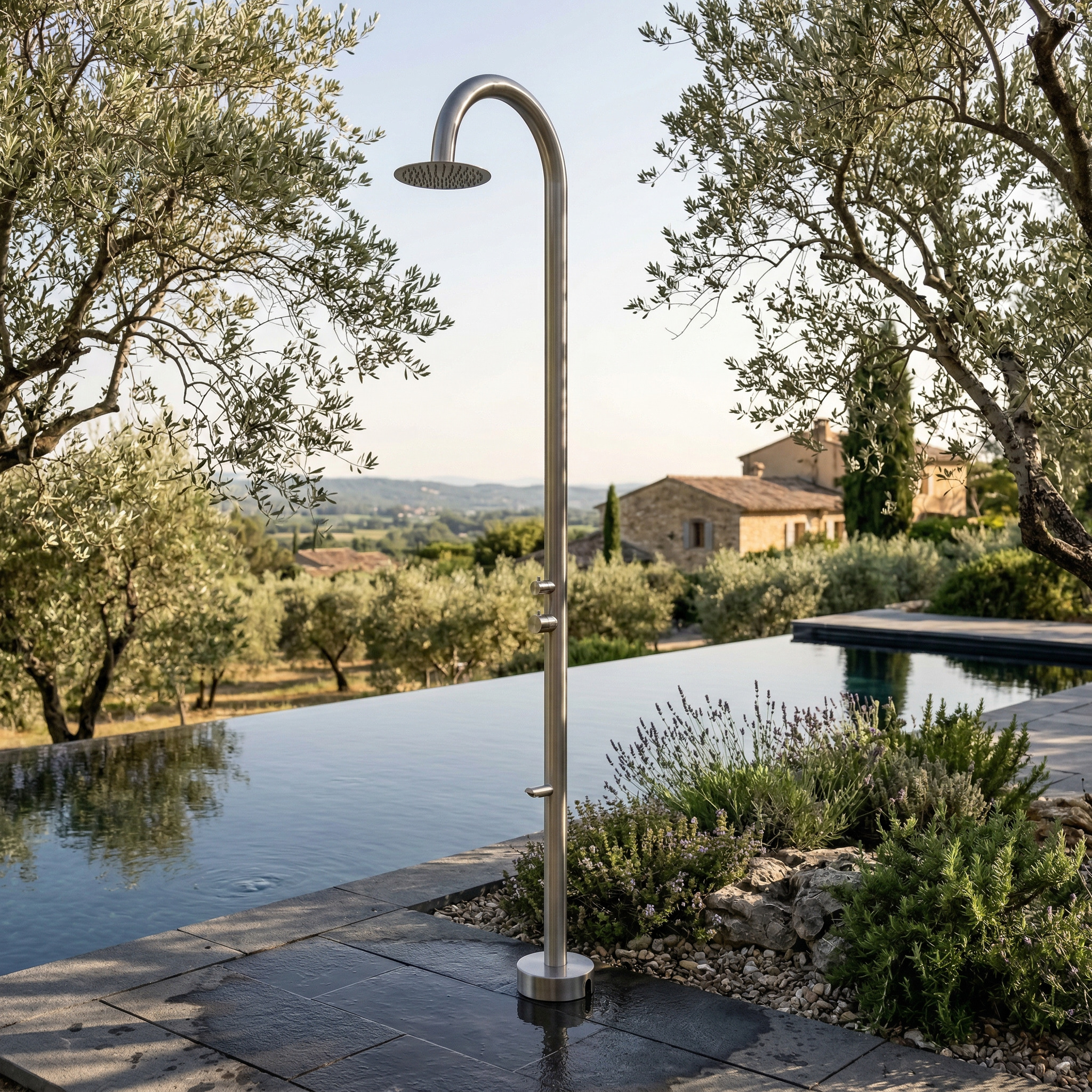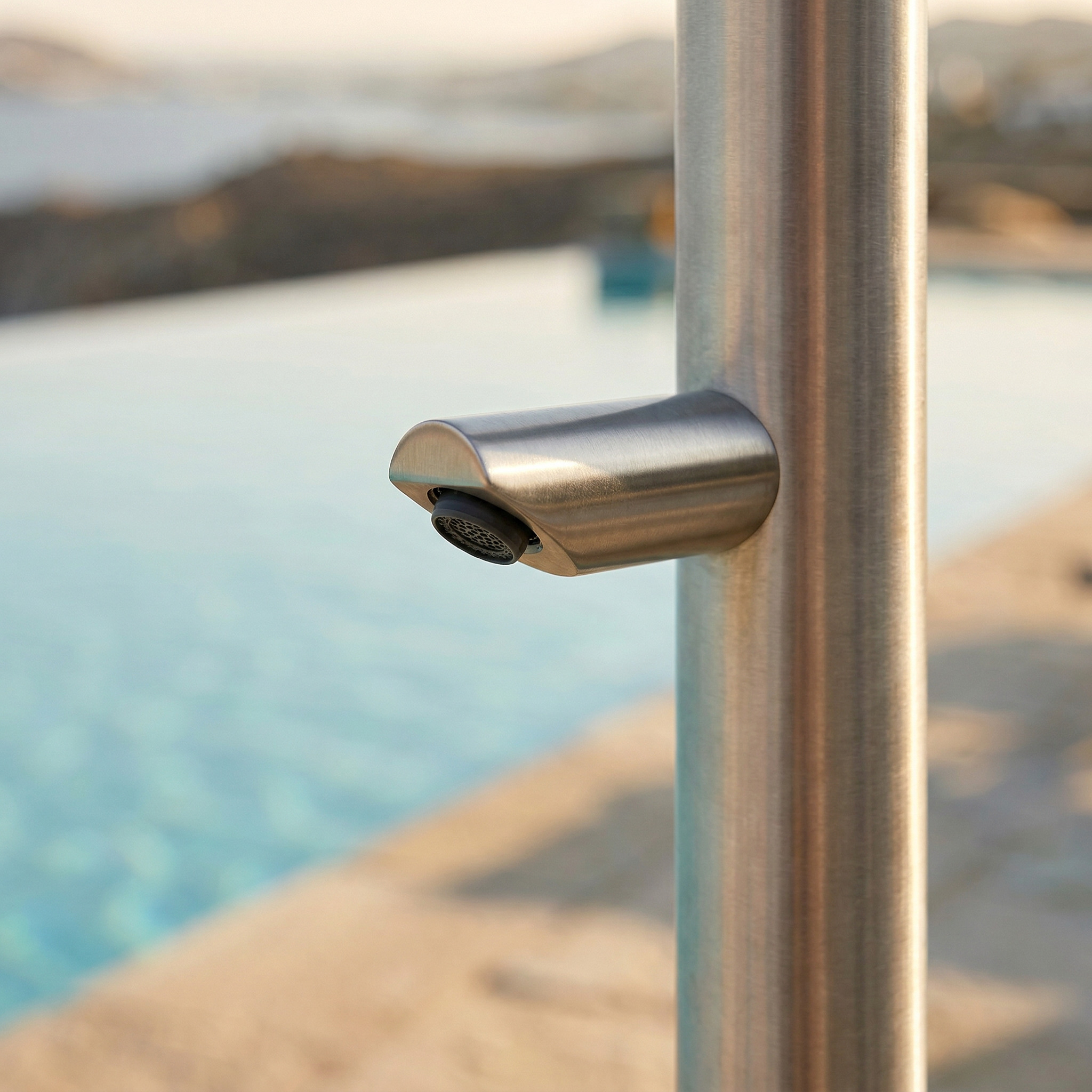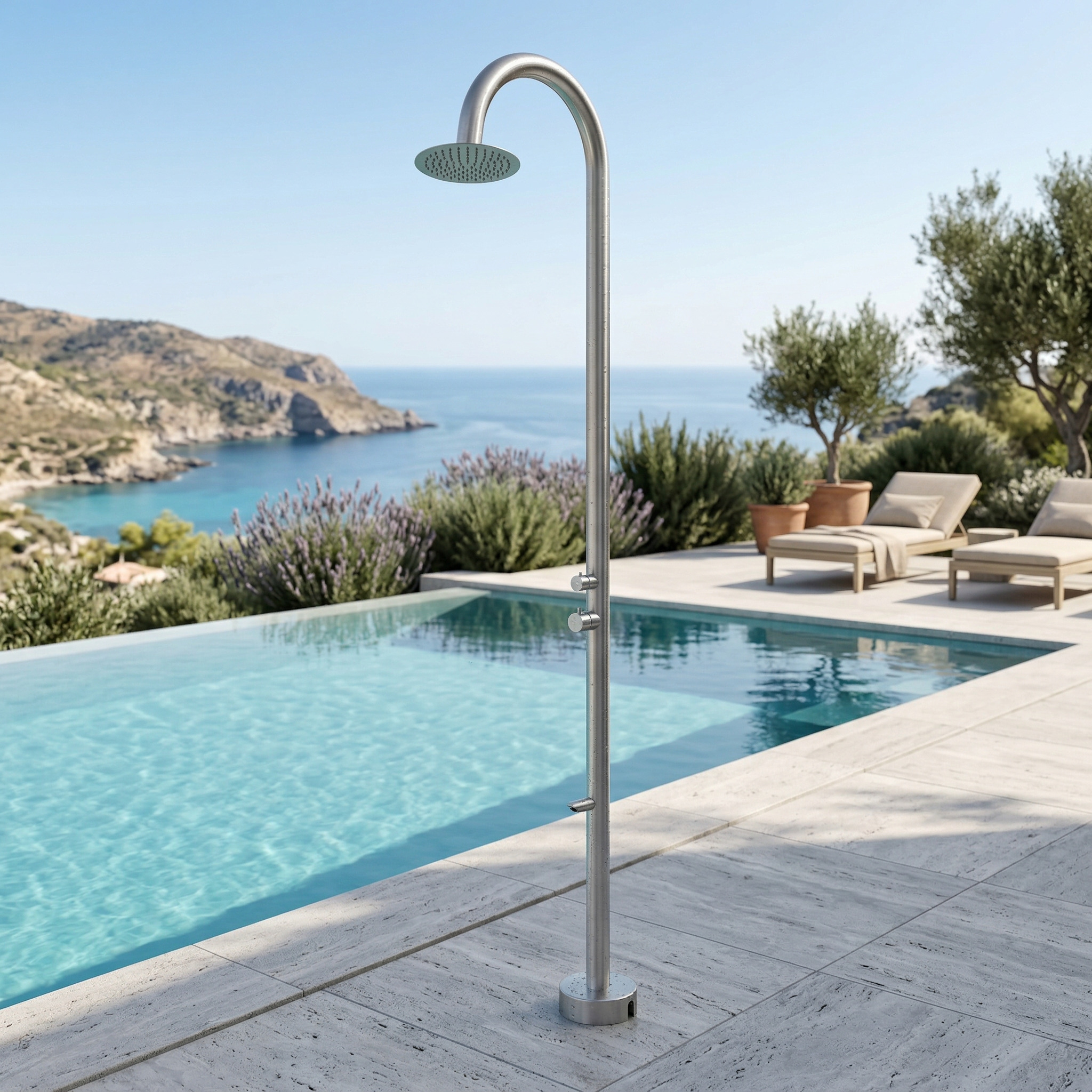 Cette douche d'extérieure combine liberté d’installation (eau chaude et froide, ou simple tuyau d’arrosage), une robustesse maximale et un design premium et intemporel. Que vous cherchiez une solution pour vous rincer avant/après la piscine, ou une installation complète avec eau chaude, cette douche répond à toutes les configurations.