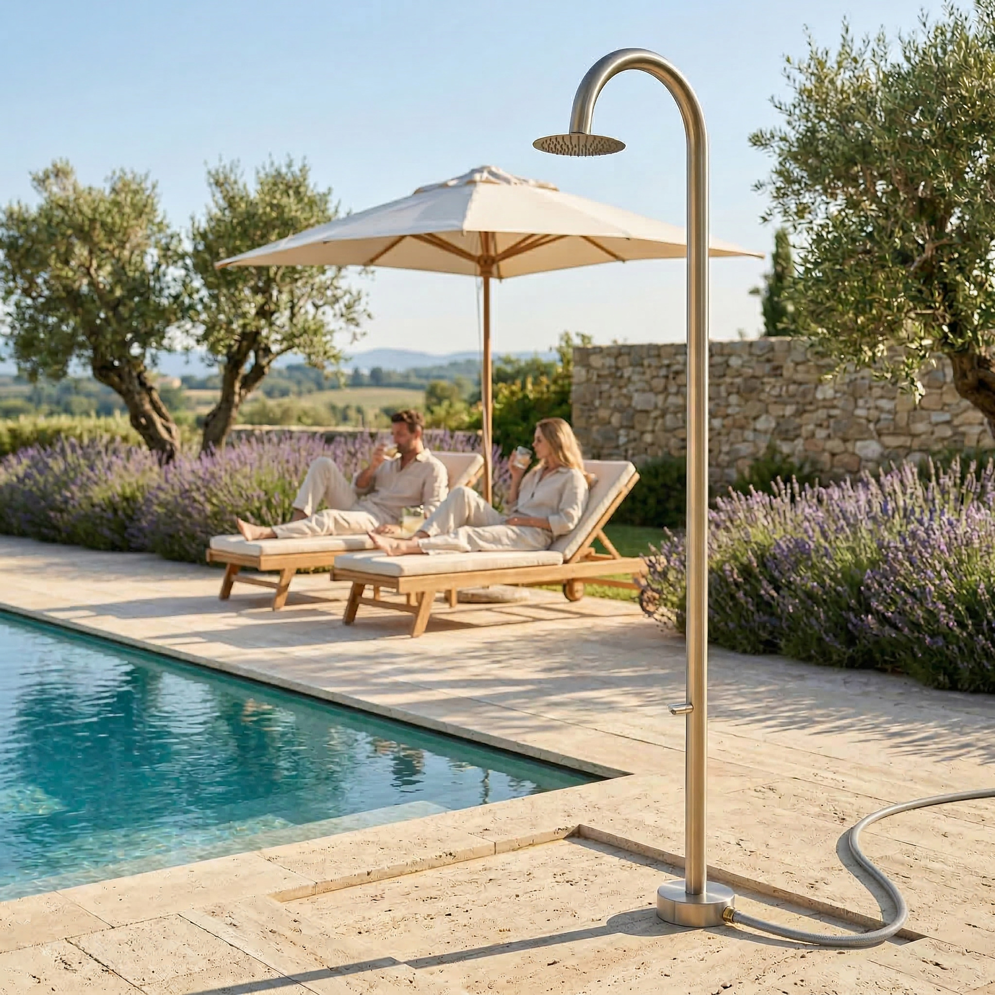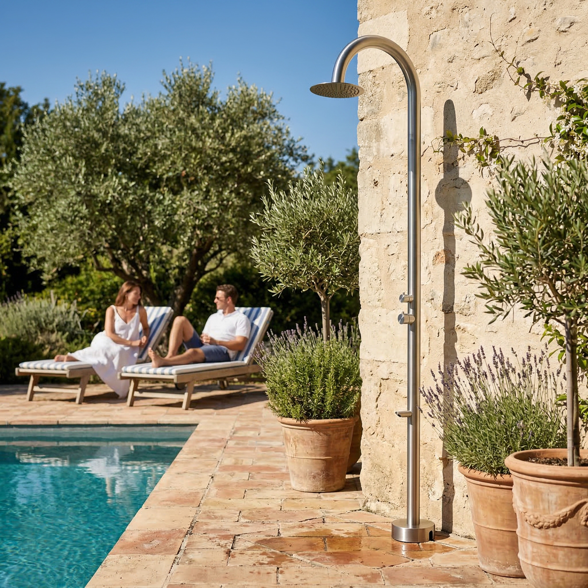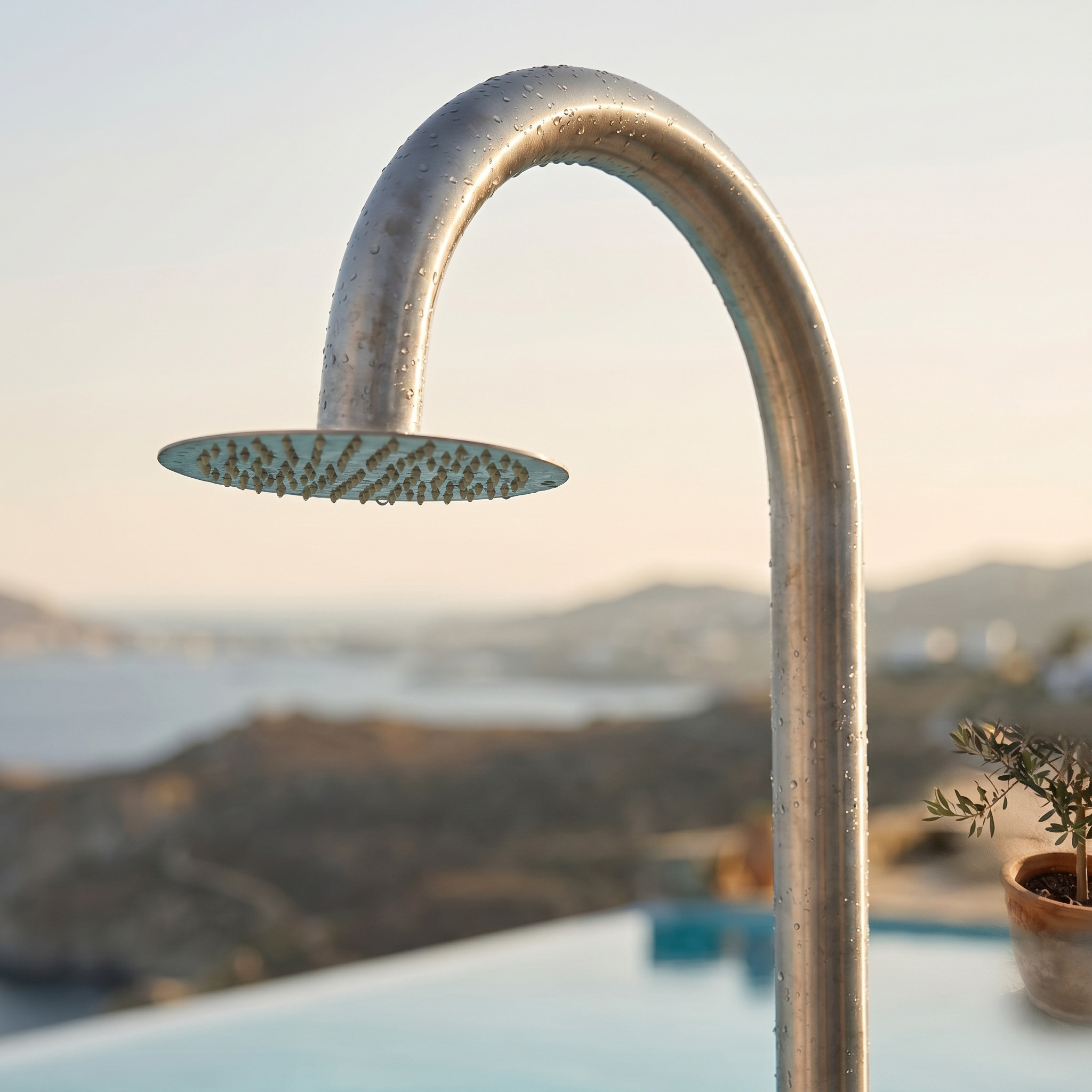Cette douche d'extérieure combine liberté d’installation (eau chaude et froide, ou simple tuyau d’arrosage), une robustesse maximale et un design premium et intemporel. Que vous cherchiez une solution pour vous rincer avant/après la piscine, ou une installation complète avec eau chaude, cette douche répond à toutes les configurations.