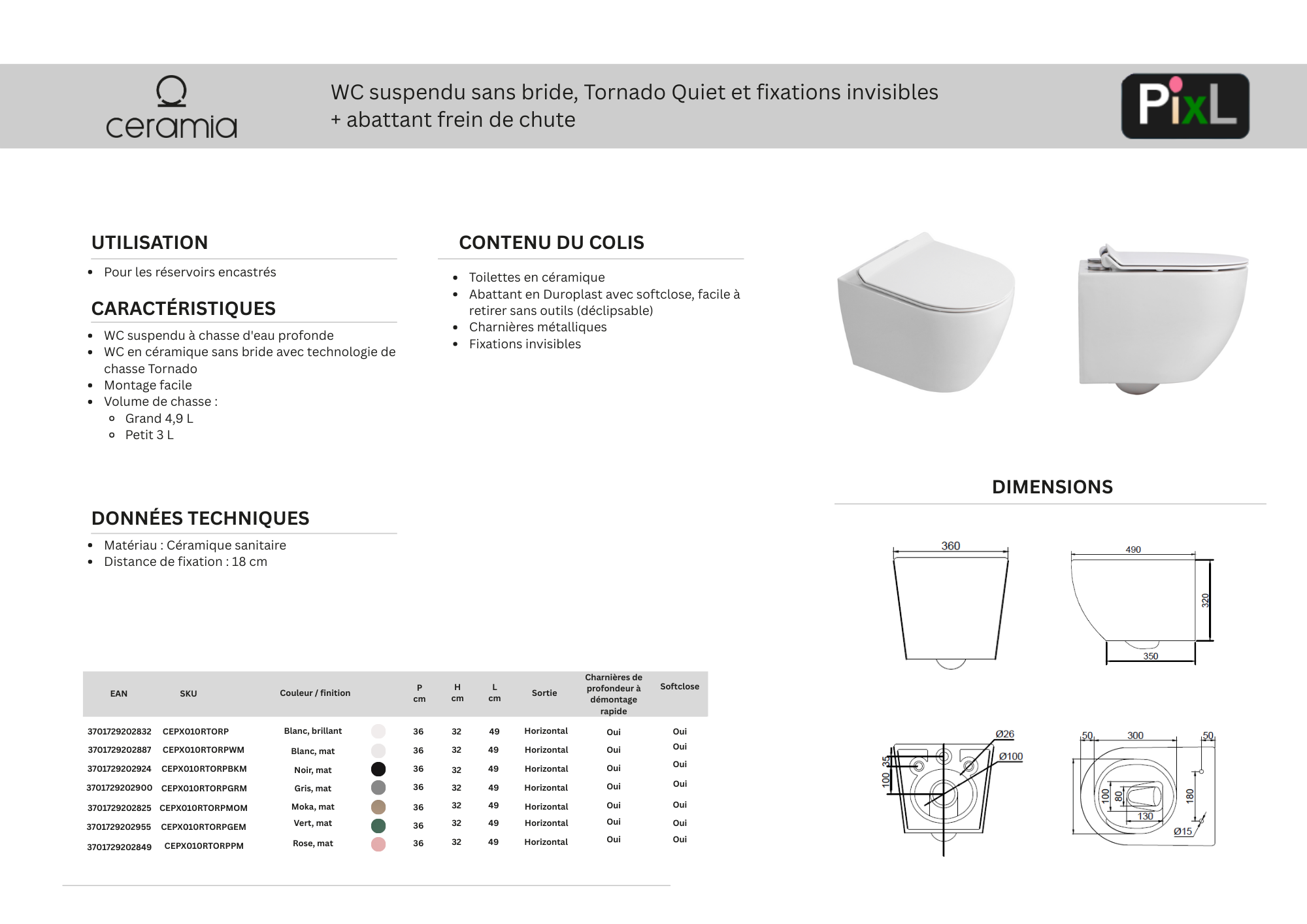 Caractéristiques du WC suspendu en céramique sans bride Ceramia PixL avec technologie Tornado Quiet Flush, fixations invisibles et abattant Soft-Close, Moka mat (CEPX010RTORPMOM) :