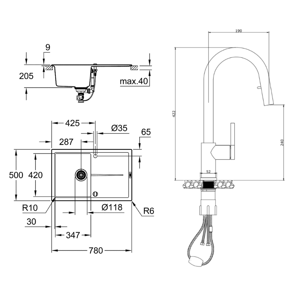 Caractéristiques de l'évier en quartz composite avec égouttoir réversible 780x500 mm Grohe K400 + Ceramia Timeless mitigeur (G31639TML2BG-SET) :