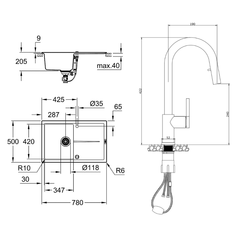 Caractéristiques de l'évier en quartz composite avec égouttoir réversible 780x500 mm Grohe K400 + Ceramia Timeless mitigeur (G31639TML2BCP-SET) :