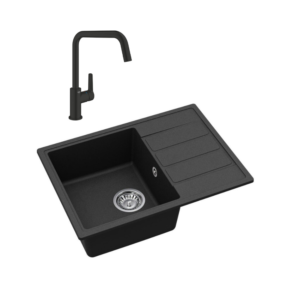 62x44 cm évier avec égouttoir réversible en Granite, à encastrer, noir + mitigeur lavabo/cuisine Grohe Start (SATSE2BG430)