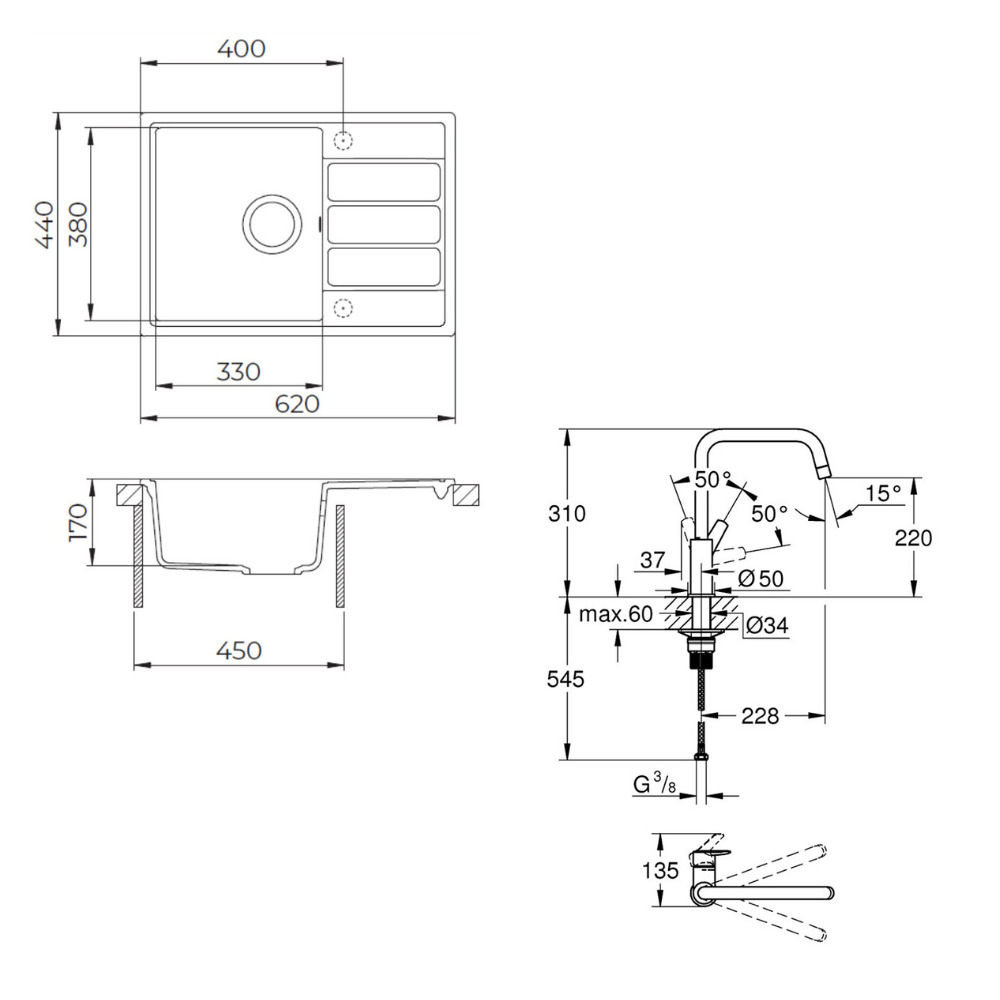 Caractéristiques du kit évier avec égouttoir réversible en Granite, à encastrer 62x44 cm, Swiss Aqua Technologies, noir + mitigeur lavabo/cuisine Grohe Start (SATSE2BG430) :