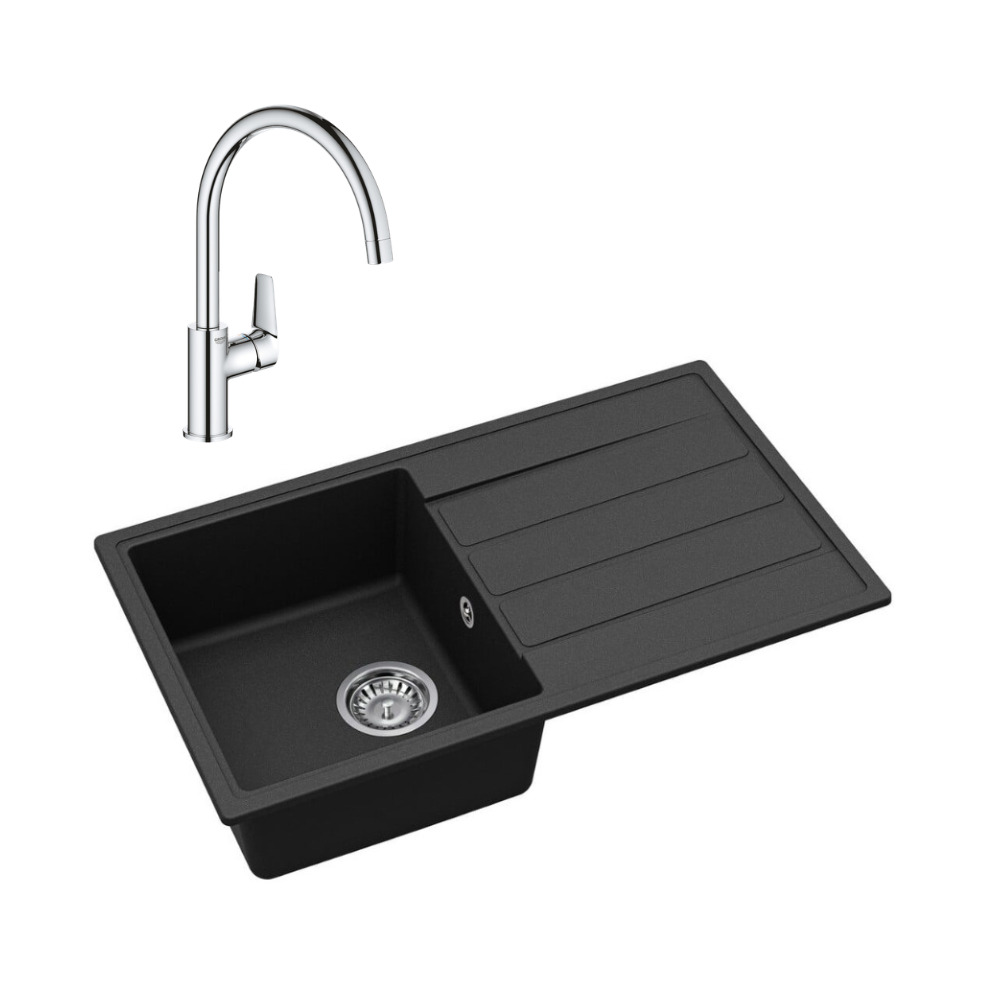 76x44 cm évier avec égouttoir réversible en Granite, à encastrer, noir + mitigeur lavabo/cuisine Grohe StartEdge (SATSE3BG313)