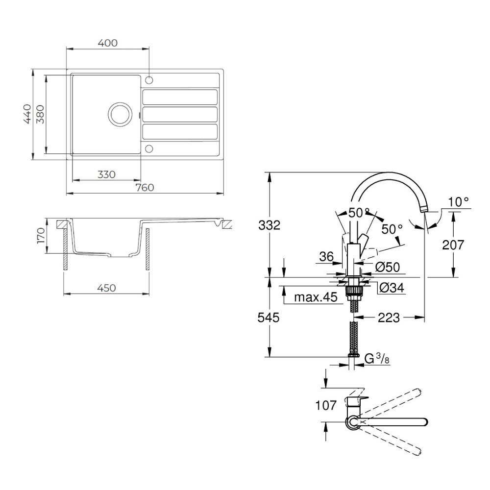Caractéristiques de l'évier avec égouttoir réversible en Granite 76x44 cm, à encastrer, Swiss Aqua Technologies, noir + mitigeur lavabo/cuisine Grohe StartEdge (SATSE3BG313) :