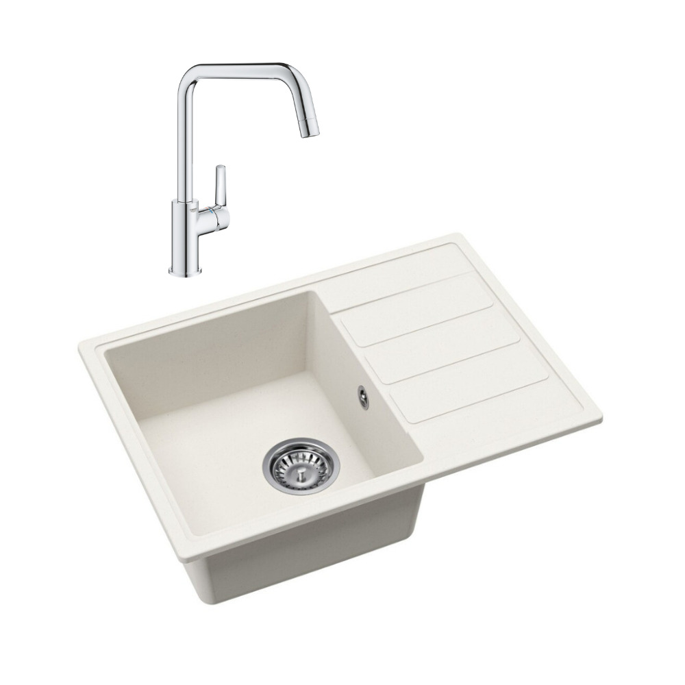 62x44 cm kit évier avec égouttoir réversible en Granite, à encastrer, blanc + mitigeur lavabo/cuisine Grohe Start (SATSE2WG304)