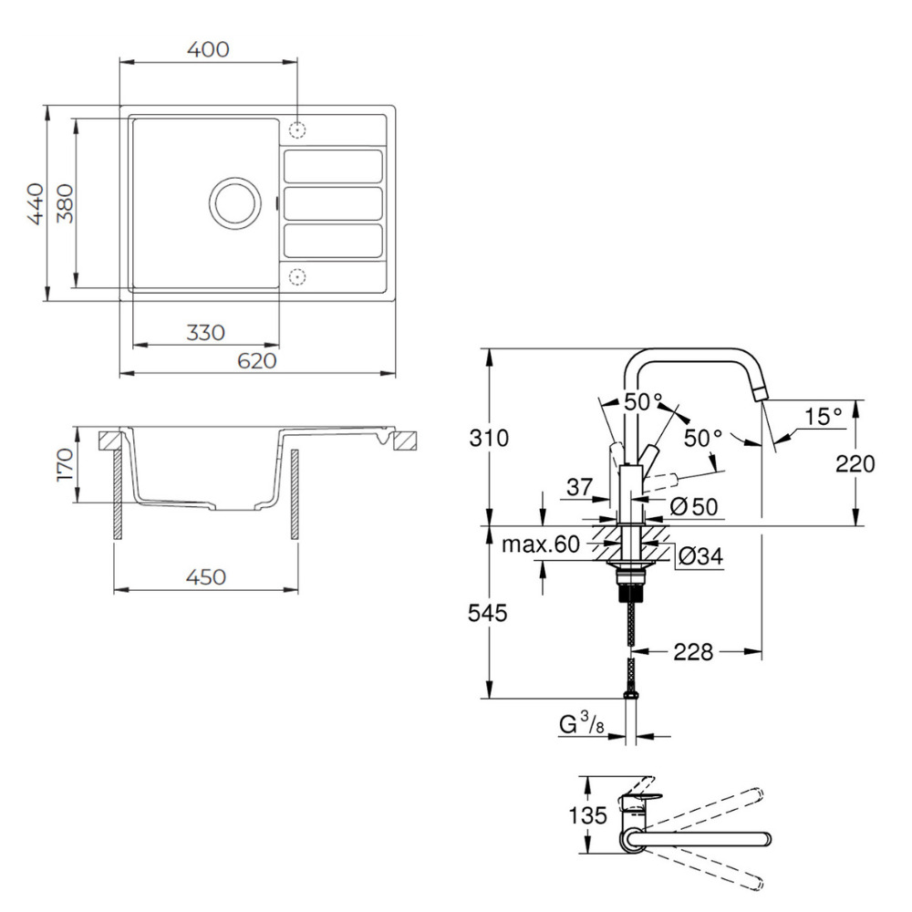 Caractéristiques du kit évier avec égouttoir réversible en Granite 62x44 cm, à encastrer, Swiss Aqua Technologies, blanc + mitigeur lavabo/cuisine Grohe Start (SATSE2WG304) :