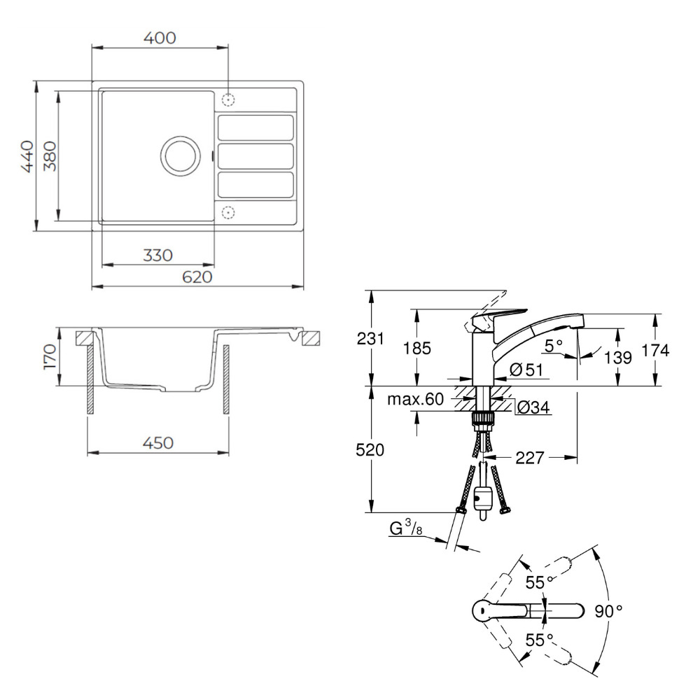 - Dimensions de l'évier : 62x44 cm