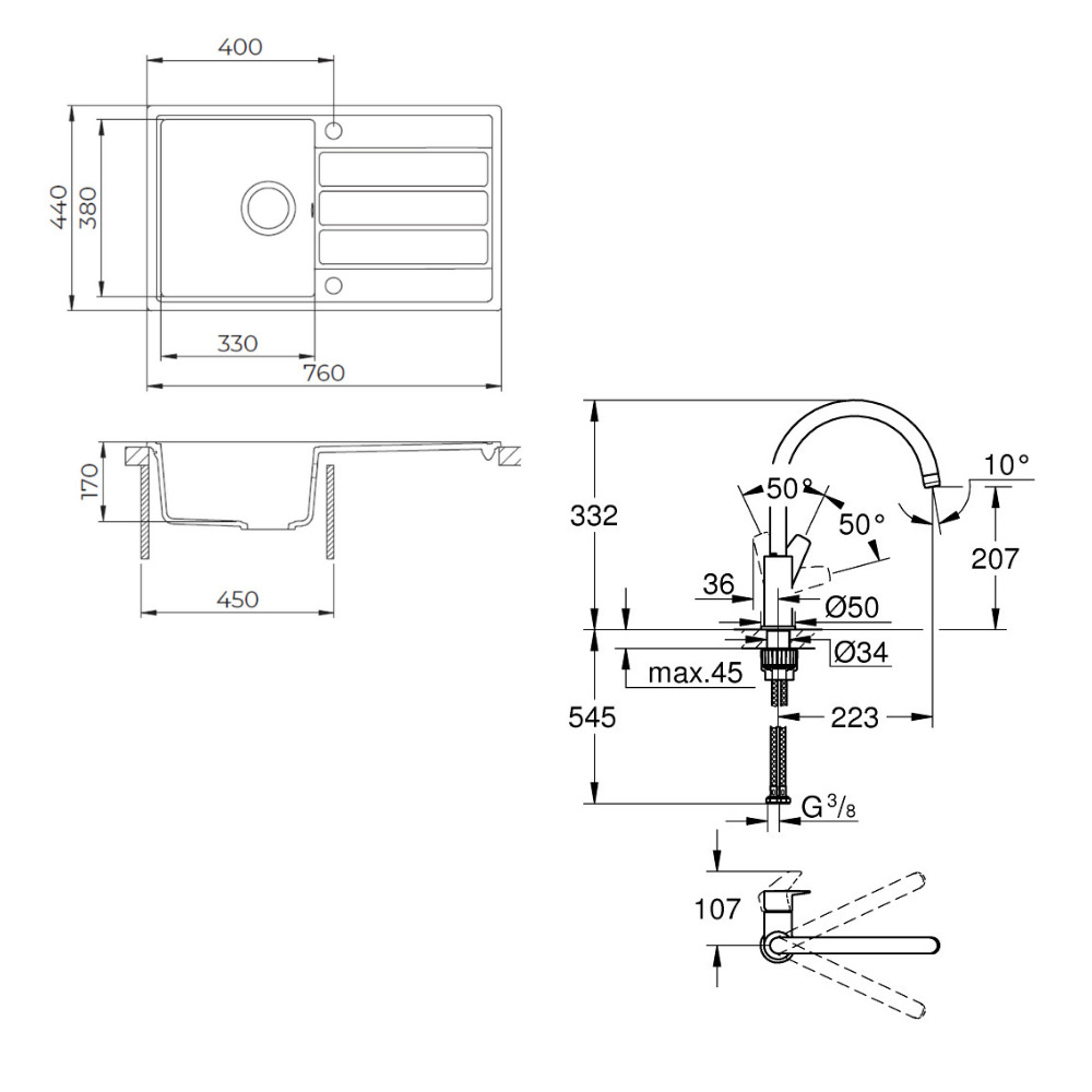 Caractéristiques du kit évier avec égouttoir réversible en Granite 76x44 cm, à encastrer, Swiss Aqua Technologies, blanc + mitigeur lavabo/cuisine Grohe StartEdge (SATSE3WG313) :