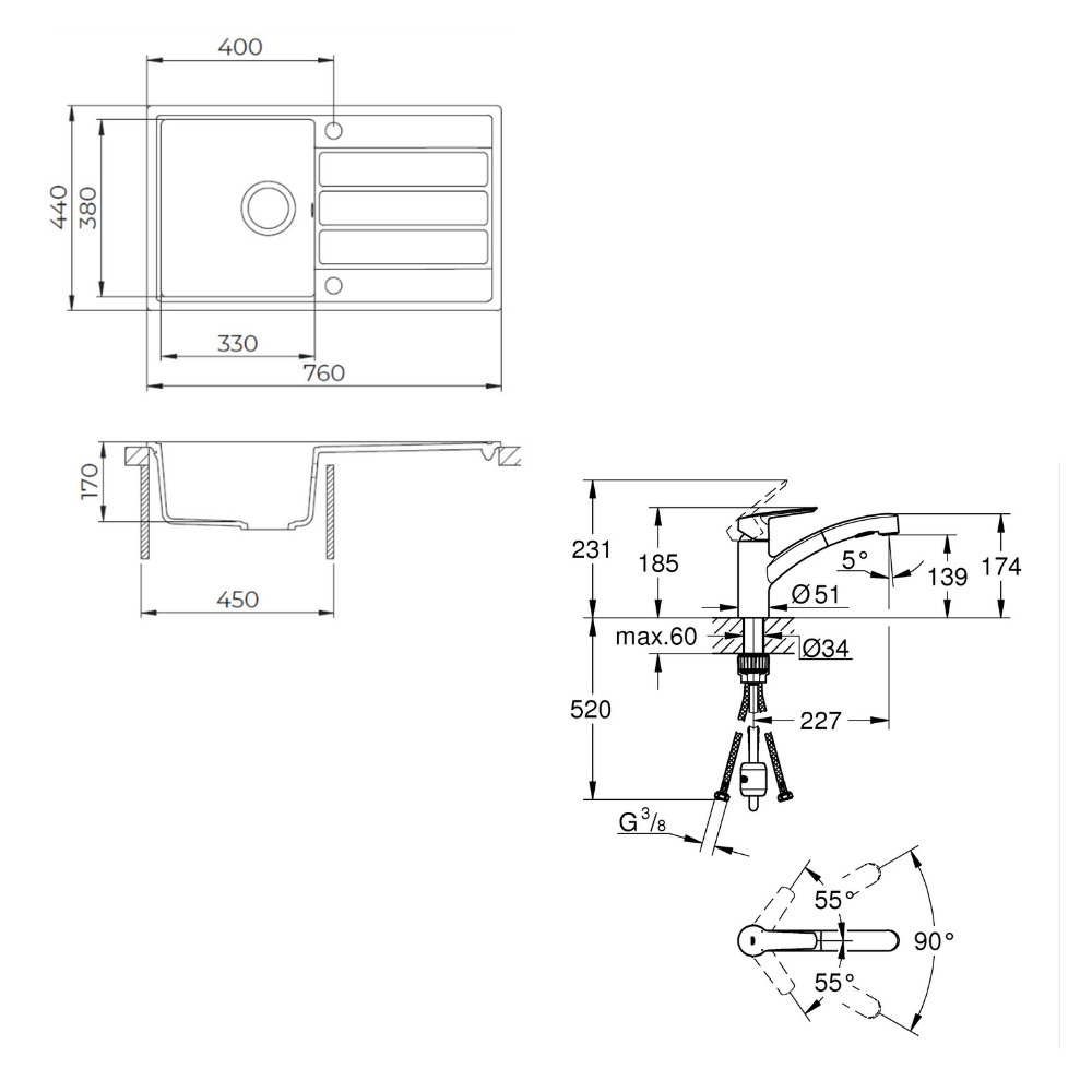Caractéristiques du kit évier avec égouttoir réversible en Granite 76x44 cm, à encastrer, Swiss Aqua Technologies, blanc + mitigeur lavabo/cuisine Grohe Start (SATSE3WG303) :