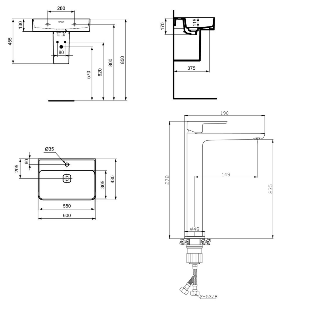 Caractéristiques du lavabo 600x430 mm 1 trou Ideal Standard Strada II + Swiss Aqua Technologies Mood mitigeur lavabo XL avec levier sans tirette, chrome (T300001SATBSM285) :