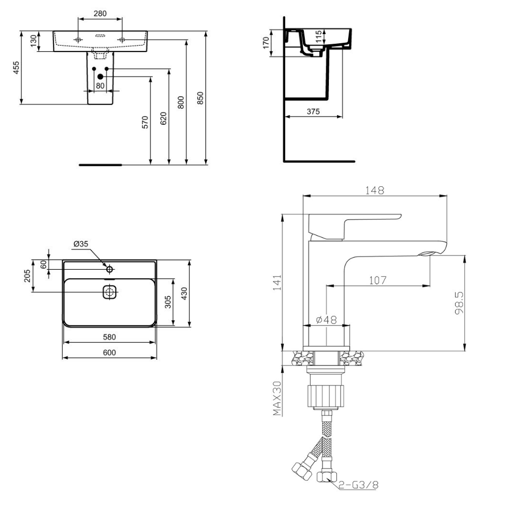 Caractéristiques du lavabo 600x430 mm 1 trou Ideal Standard Strada II + Swiss Aqua Technologies Mood mitigeur lavabo sans tirette, noir mat (T300001SATBSM271C) :
