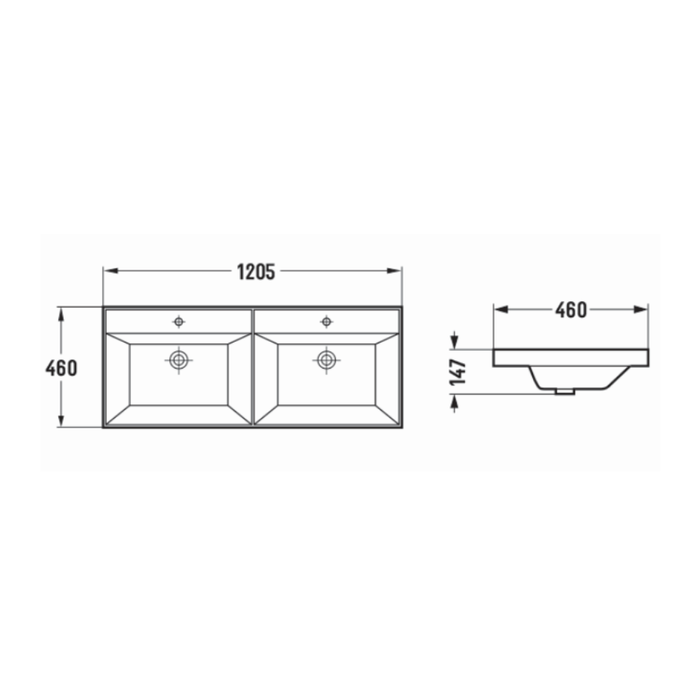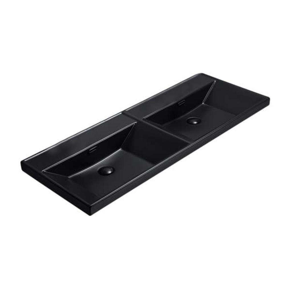 Caractéristiques du meuble double vasque semi-encastré en céramique 120,5x46x14,7 cm, 2 trous de robinetterie au milieu, avec trop-plein, sans siphon, Swiss Aqua Technoogies B-Way, noir mat (SATBW212046BKM) :