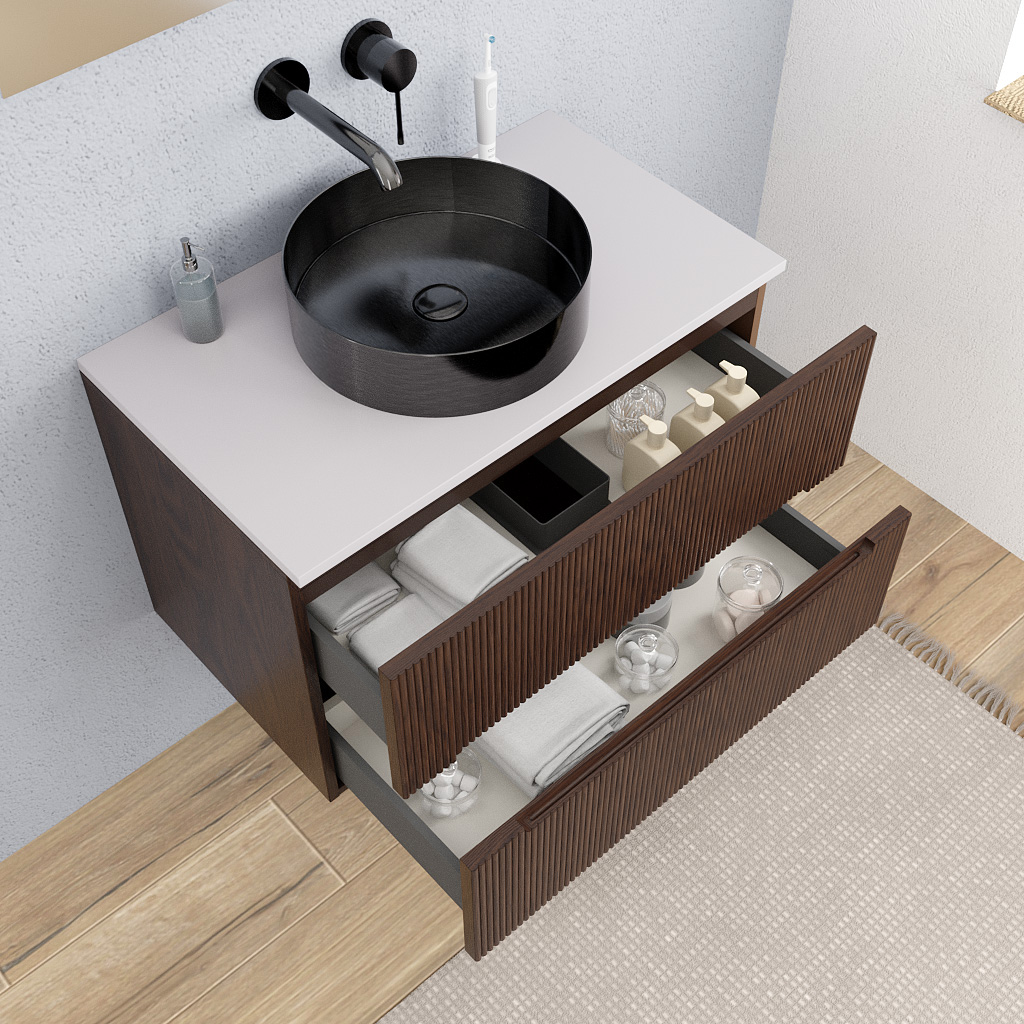 Doté de deux tiroirs spacieux à fermeture amortie, dont un avec découpe en U pour le siphon, il est idéal pour garder vos produits du quotidien à portée de main sans encombrer la pièce. Ce meuble résiste à l’humidité et est livré déjà monté, prêt à poser. Un meuble de salle de bain 80 cm à la fois pratique, tendance et durable.