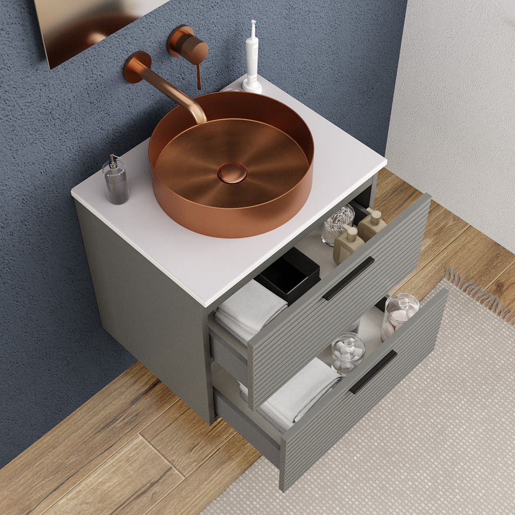 Compact, élégant et pensé pour durer, le set Ceramia 60 cm gris foncé se compose d’un meuble suspendu préassemblé à deux tiroirs et d’un plan vasque blanc mat assorti. Cette solution complète est idéale pour optimiser une petite salle de bain ou une salle d’eau d’appoint, tout en apportant une touche contemporaine affirmée à votre aménagement.