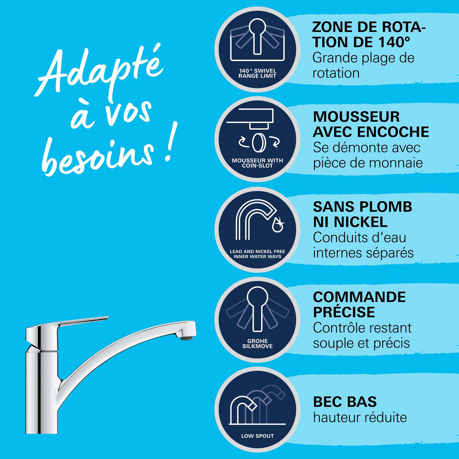 Caractéristiques du Mitigeur Monocommande Evier, Grohe Start, Chrome (31138002) :