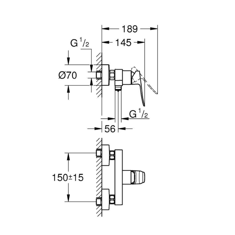 Caractéristiques du mitigeur monocommande de douche mural à levier 150 mm, sans ensemble de douche, Grohe Dice, chrome brillant (1018740000) :