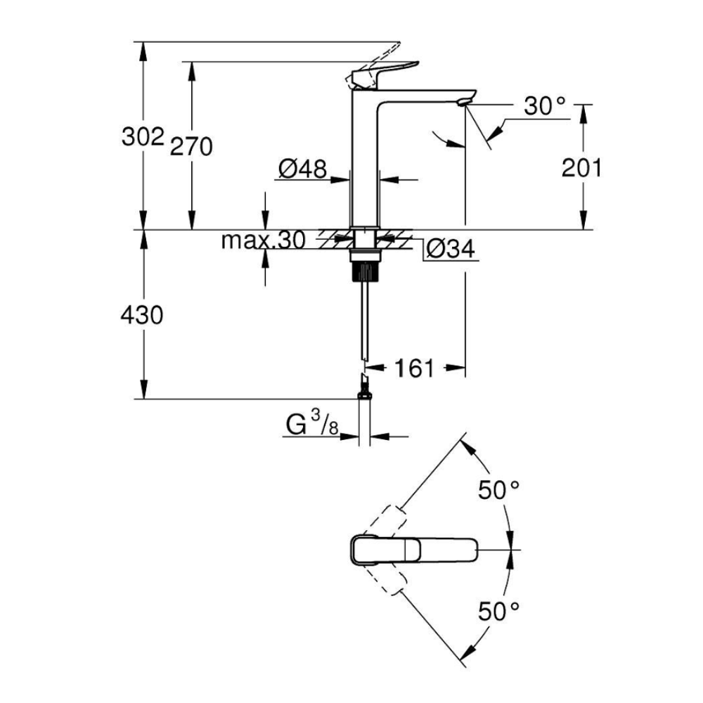 Caractéristiques du mitigeur monocommande de lavabo à levier avec vidage Clic-Clac, cartouche céramique, Grohe Dice, noir mat (1018362430) :