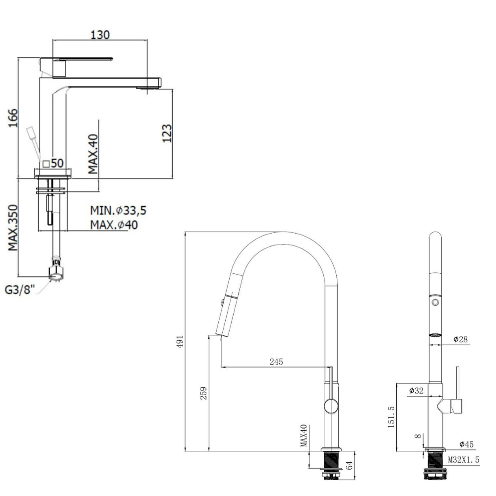 - Hauteur du mitigeur : 491 mm