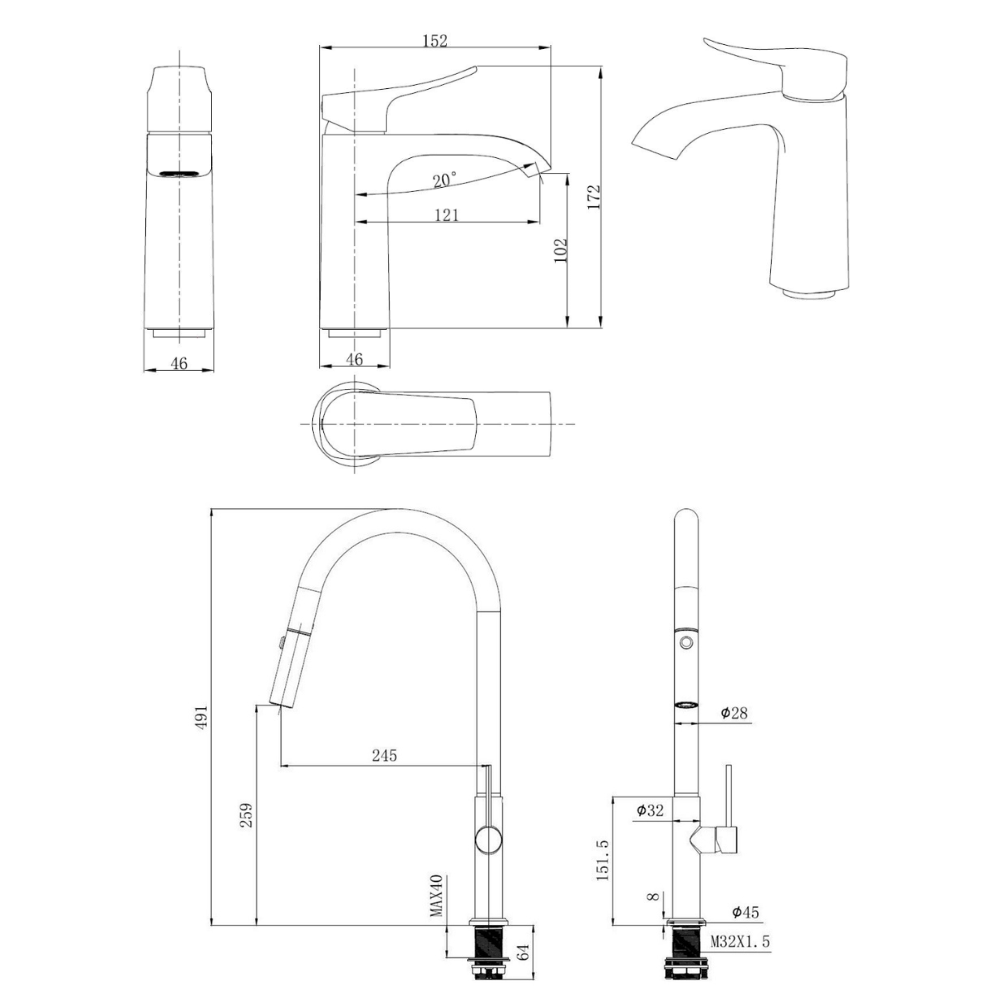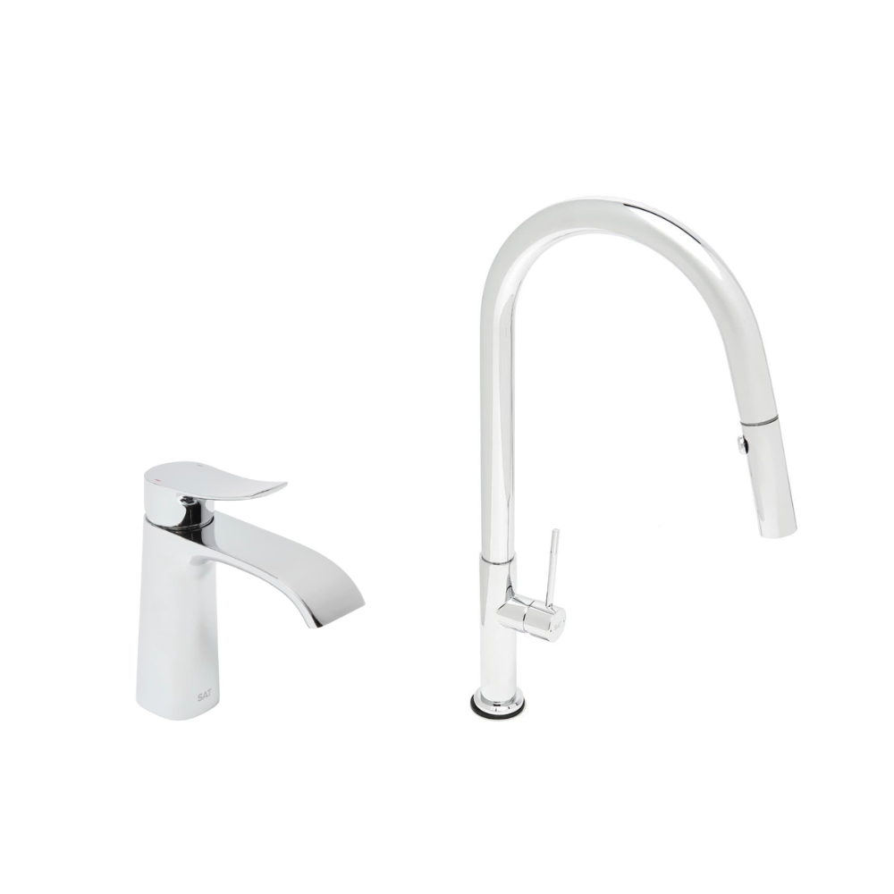 Swiss Aqua Technologies set mitigeur lavabo avec bec cascade + mitigeur cuisine, douchette extractible et bras pivotant, chrome (SATINFBSDBS271)