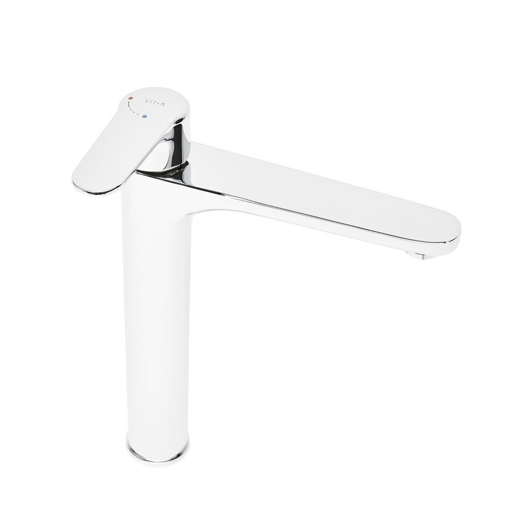 Robinet de lavabo haut sans Déchets avec fonction de démarrage à froid. Le débit est de 5 litres/minute. En finition chromée brillante.