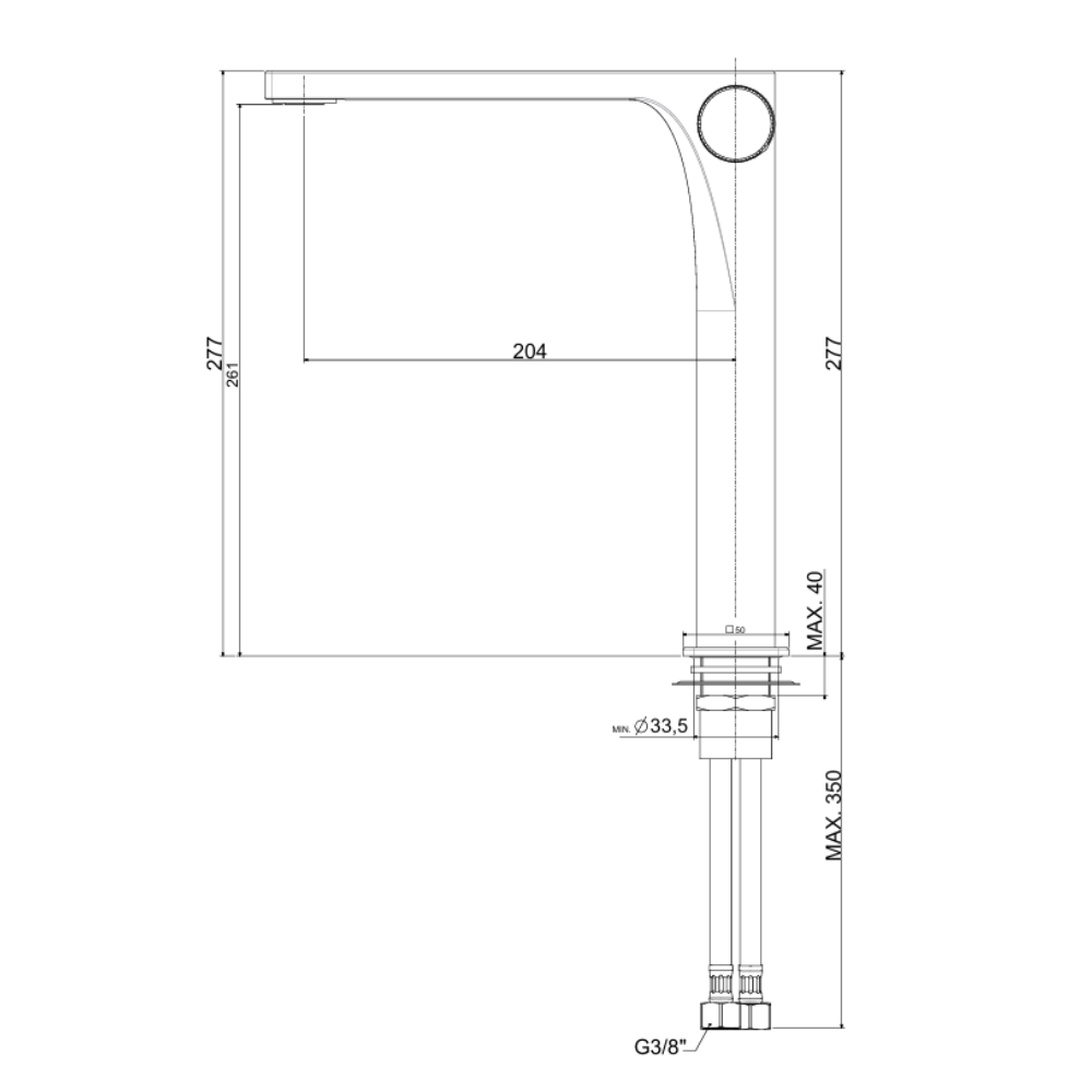Mitigeur de lavabo sur pied sans vidage de la série SAT Evolution. De forme ronde et finition chromée. Il a une hauteur de 27,7 cm, une hauteur de suspension de 26,1 cm et une longueur de suspension de 20,4 cm. Le vidage n'est pas inclus dans le mitigeur.