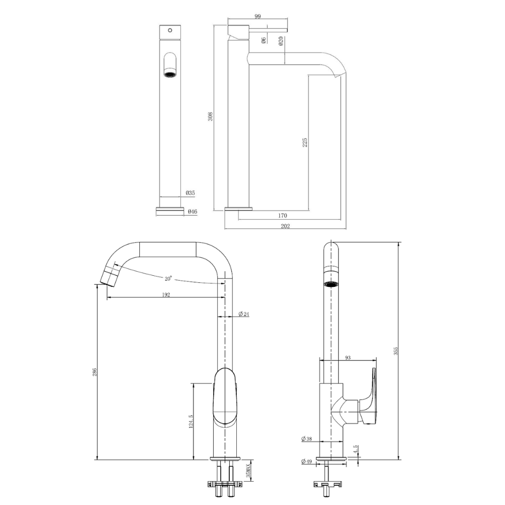 - Hauteur du robinet : 30,8 cm