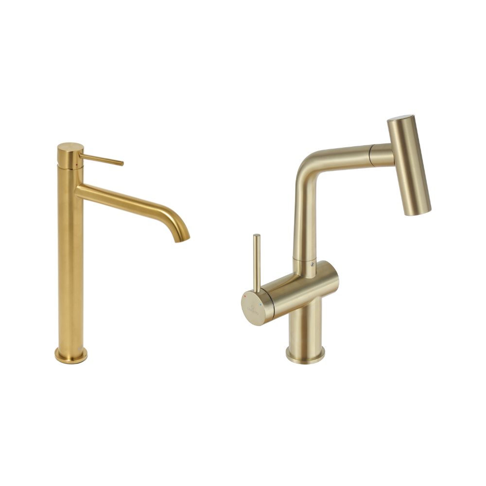 Swiss Aqua Technologies Aurum set mitigeur lavabo haut + mitigeur cuisine Ceramia Timeless acier inoxydable, douchette extractible, or (SATBA185BG)