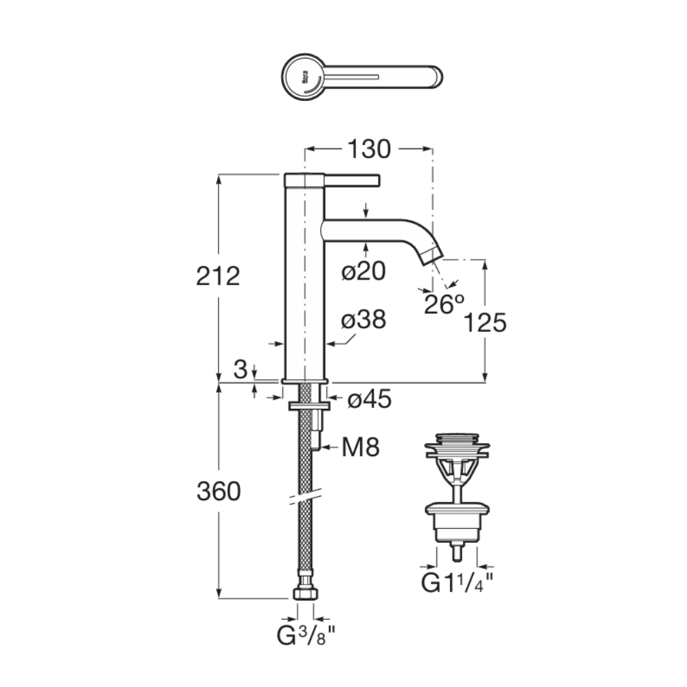 Caractéristiques du mitigeur de lavabo XL à levier, hauteur 21,2 cm, avec bonde clic-clac, Roca Ona, noir mat (A5A3C9ENB0) :