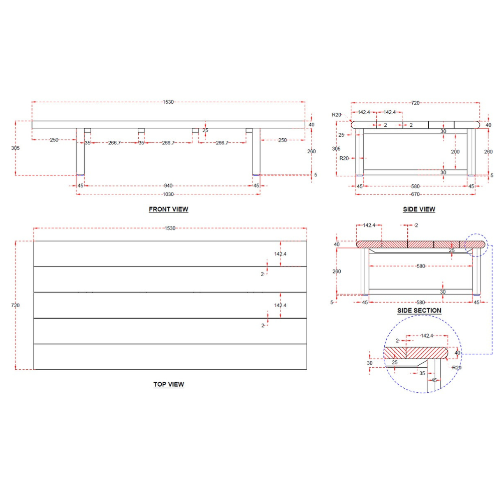Caractéristiques de la table basse de jardin en teck massif, 153x72x30,5 cm, pieds-de-table design rectangulaire (NATOFT15372S)