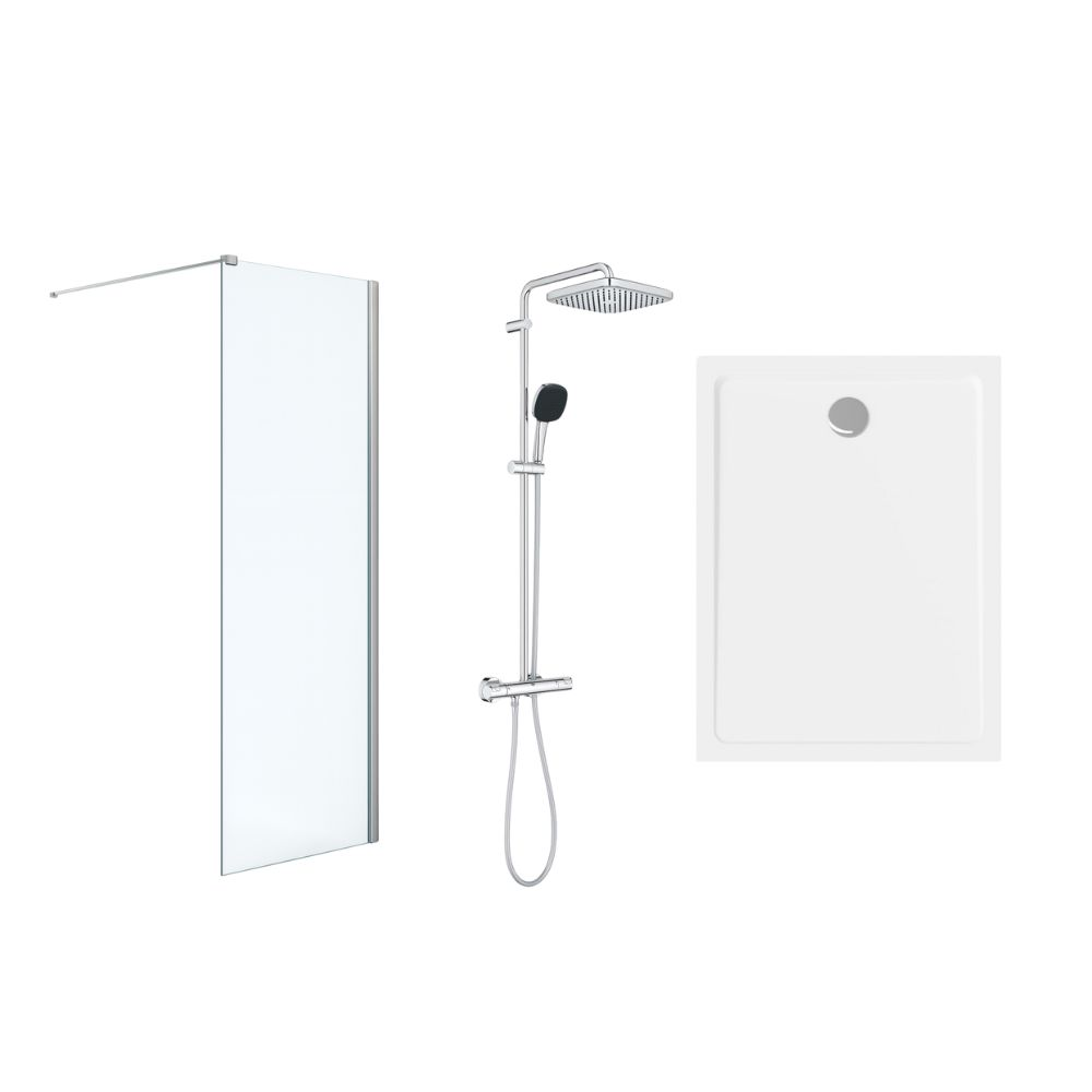 Grohe Pack Douche Complet – Paroi Walk-In 100x200 Chrome + Colonne Grohe Vitalio 2 Jets + Receveur Marbre Coulé Blanc 120x90