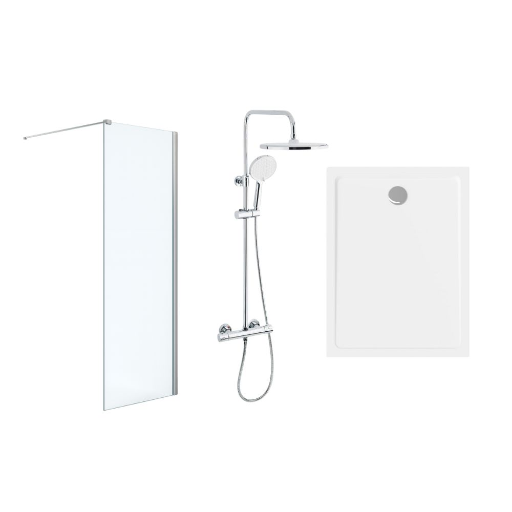 Paroi Walk-in SATBWI120PR en verre Crystal Glass® 8 mm avec traitement anticalcaire, profilés muraux et inférieurs chromés, bras de fixation inclus. Colonne de douche SATSSTKE avec mitigeur thermostatique VERNET, douche de tête 250 mm et douchette 3 jets. Receveur 120x90 cm en marbre coulé blanc émail, à poser ou encastrer, livré avec siphon.