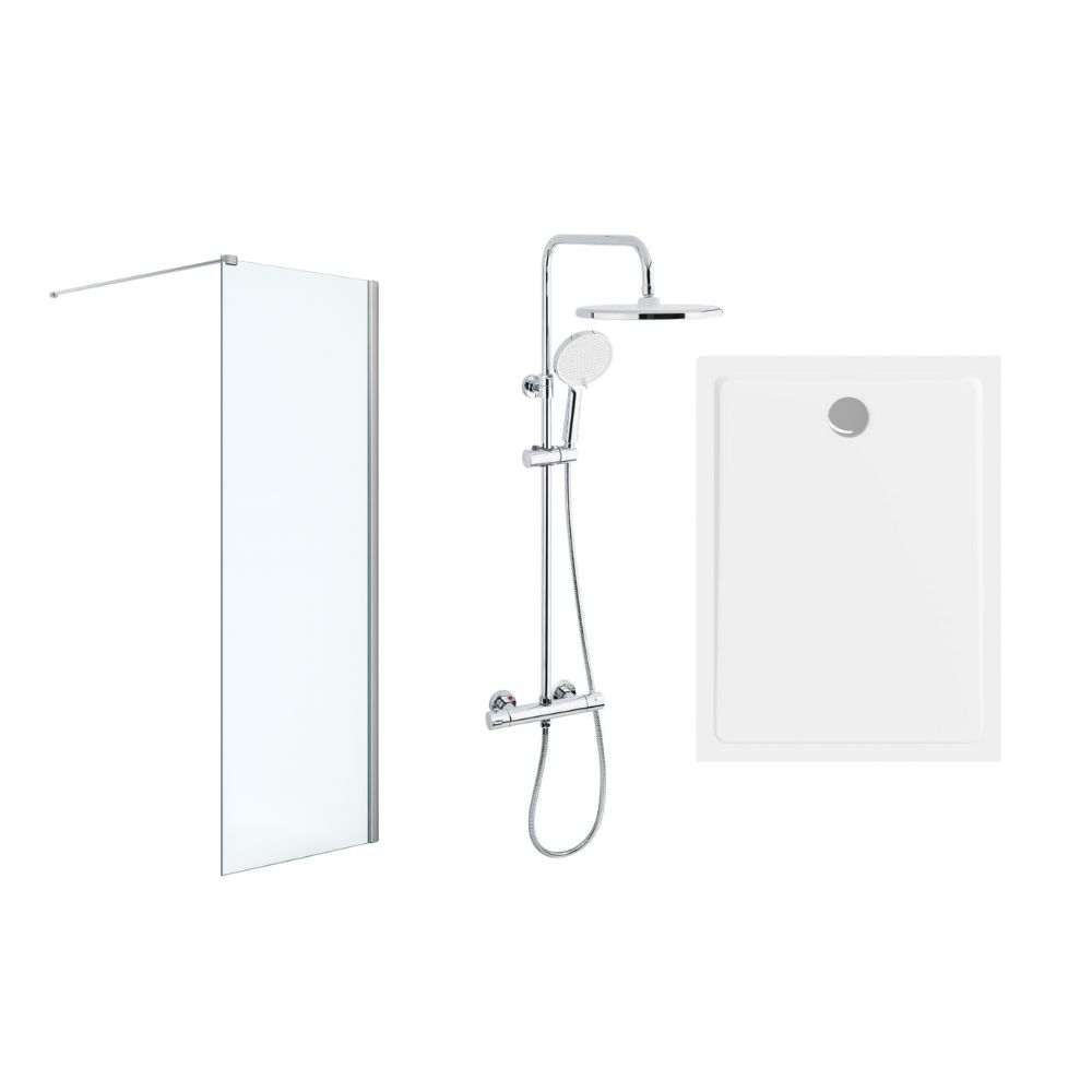 Paroi Walk-in SATBWI140PR en verre Crystal Glass® 8 mm avec traitement anticalcaire, profilés muraux et inférieurs chromés, bras de fixation inclus. Colonne de douche SATSSTKE avec mitigeur thermostatique VERNET, douche de tête 250 mm et douchette 3 jets. Receveur 140x90 cm en marbre coulé blanc émail, à poser ou encastrer, livré avec siphon.