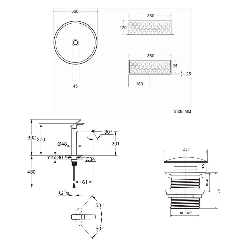 Caractéristiques du mitigeur monocommande à levier pour vasque à poser, taille XL, sans vidage, Grohe Quickfix Dice, chrome brillant + vasque à poser 36x36x12 cm, avec bonde Clic-Clac, sans trop-plein, Swiss Aqua Technologies Infinitio, noir mat (BA3-G1018920000-02) :