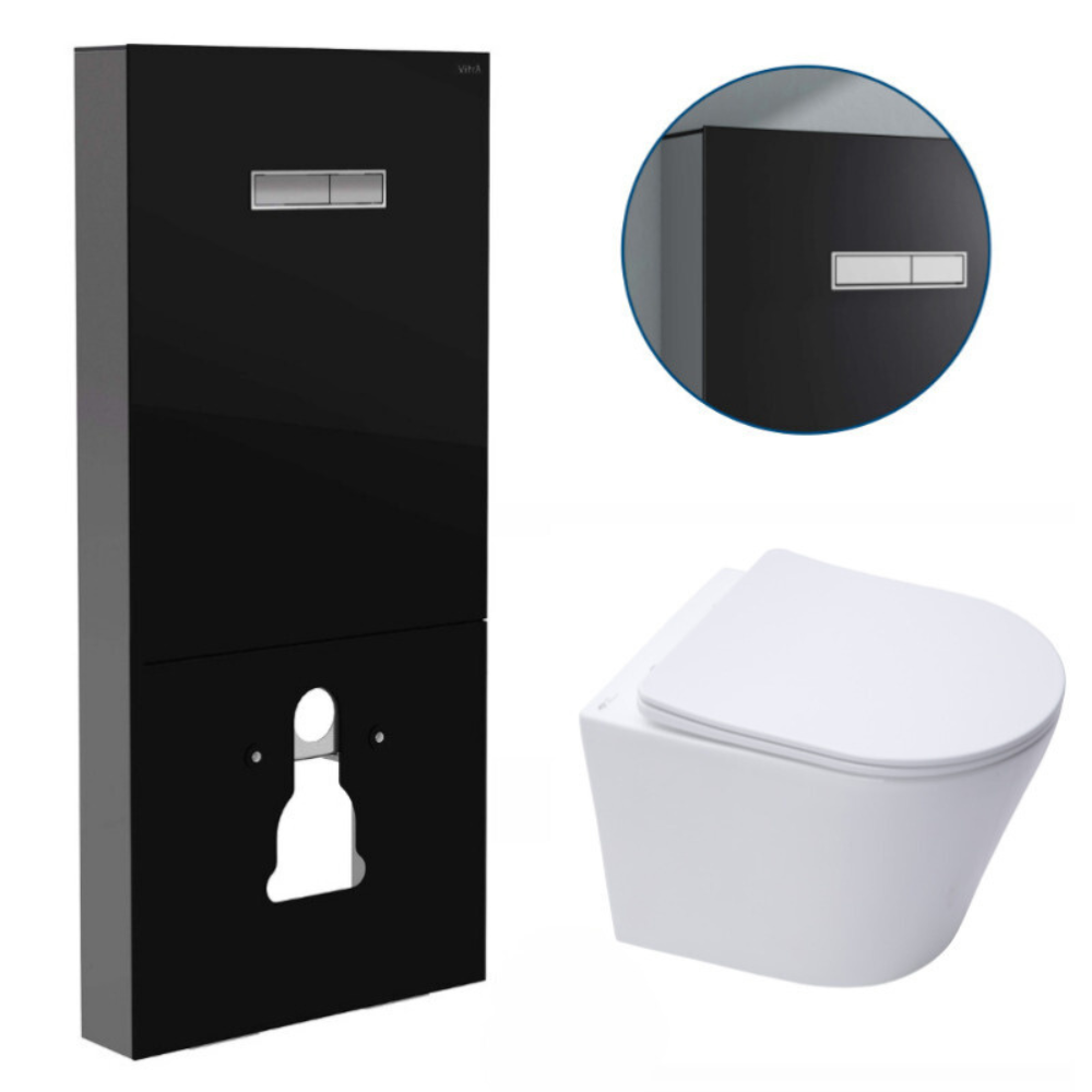 Vitra Pack Bâti support en verre trempé/aluminium brossé avec plaque intégrée, Noir brillant + WC sans bride SAT + Abattant softclose