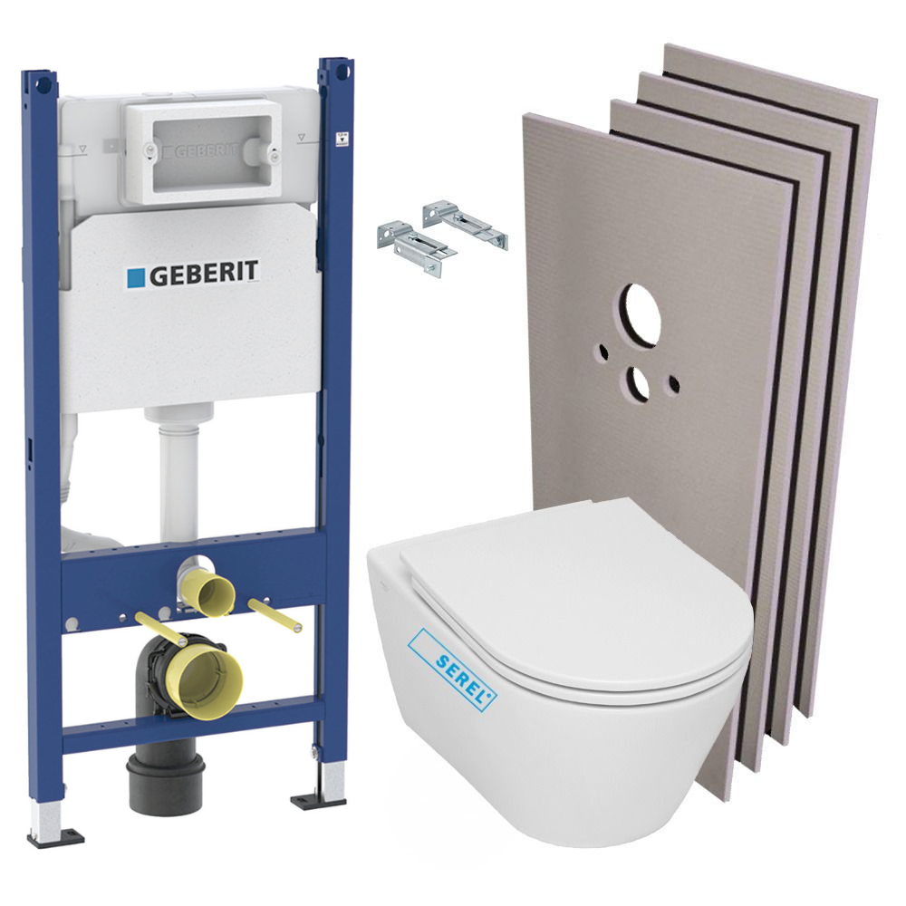 Ce pack exclusif comprend un WC suspendu sans bride Serel SP26, offrant une hygiène maximale et une installation facile grâce à son bâti-support intégré de marque GEBERIT.