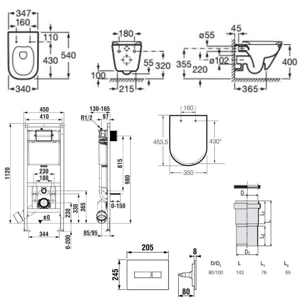 Caractéristiques du pack WC bâti-support ECO 2 L Roca + WC suspendu Roca avec abattant SoftClose + plaque noir mat (ROROGAWR04-FR) :